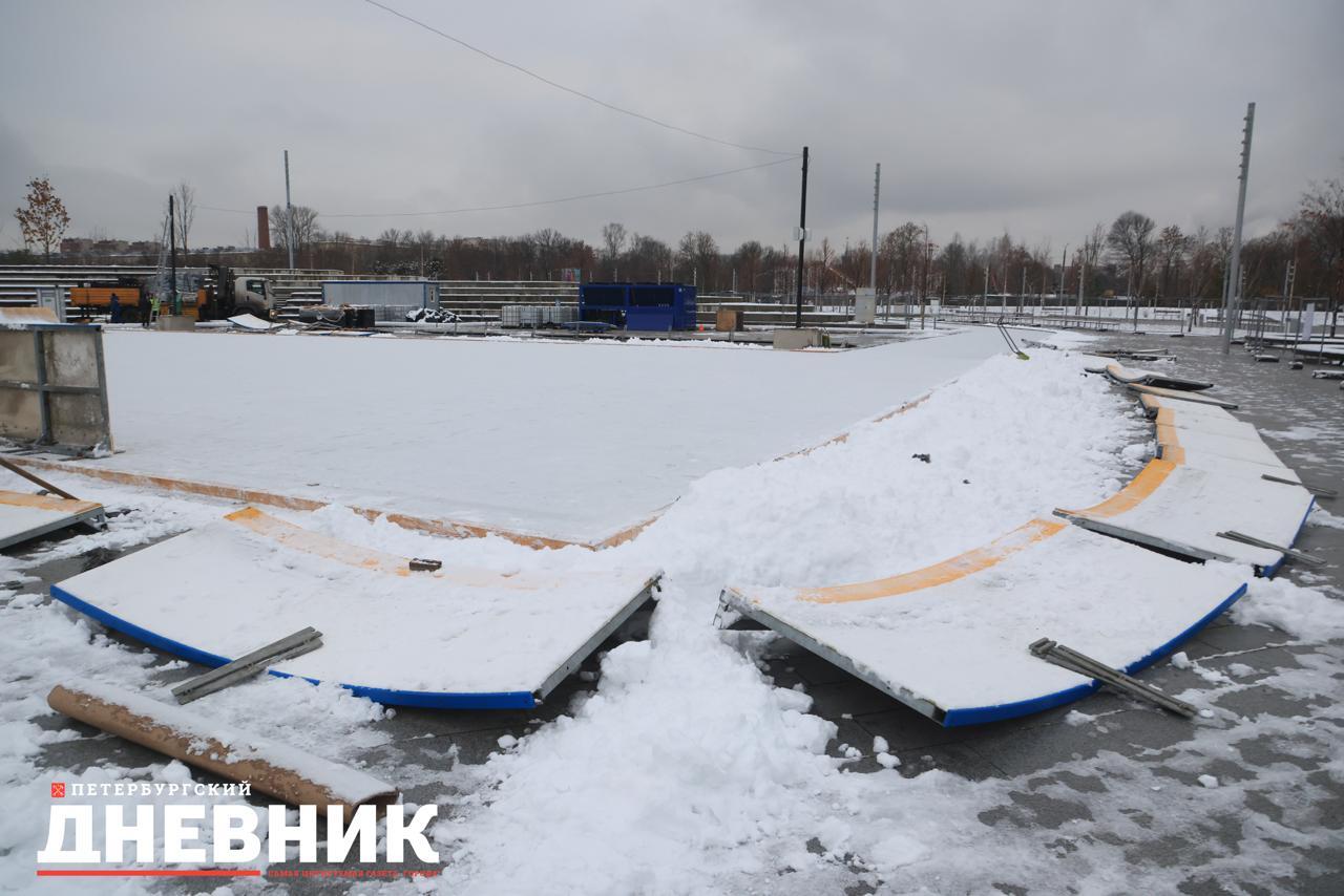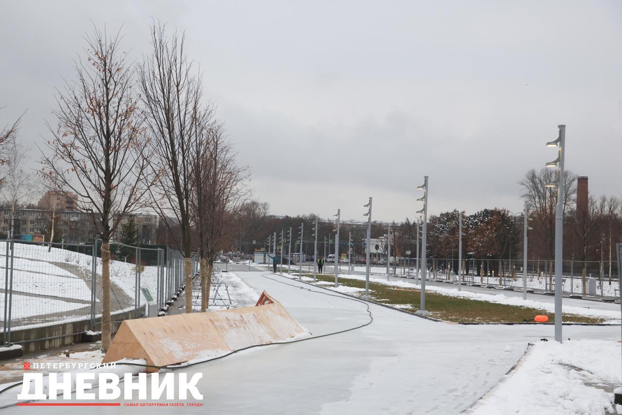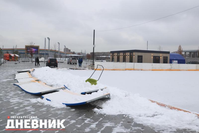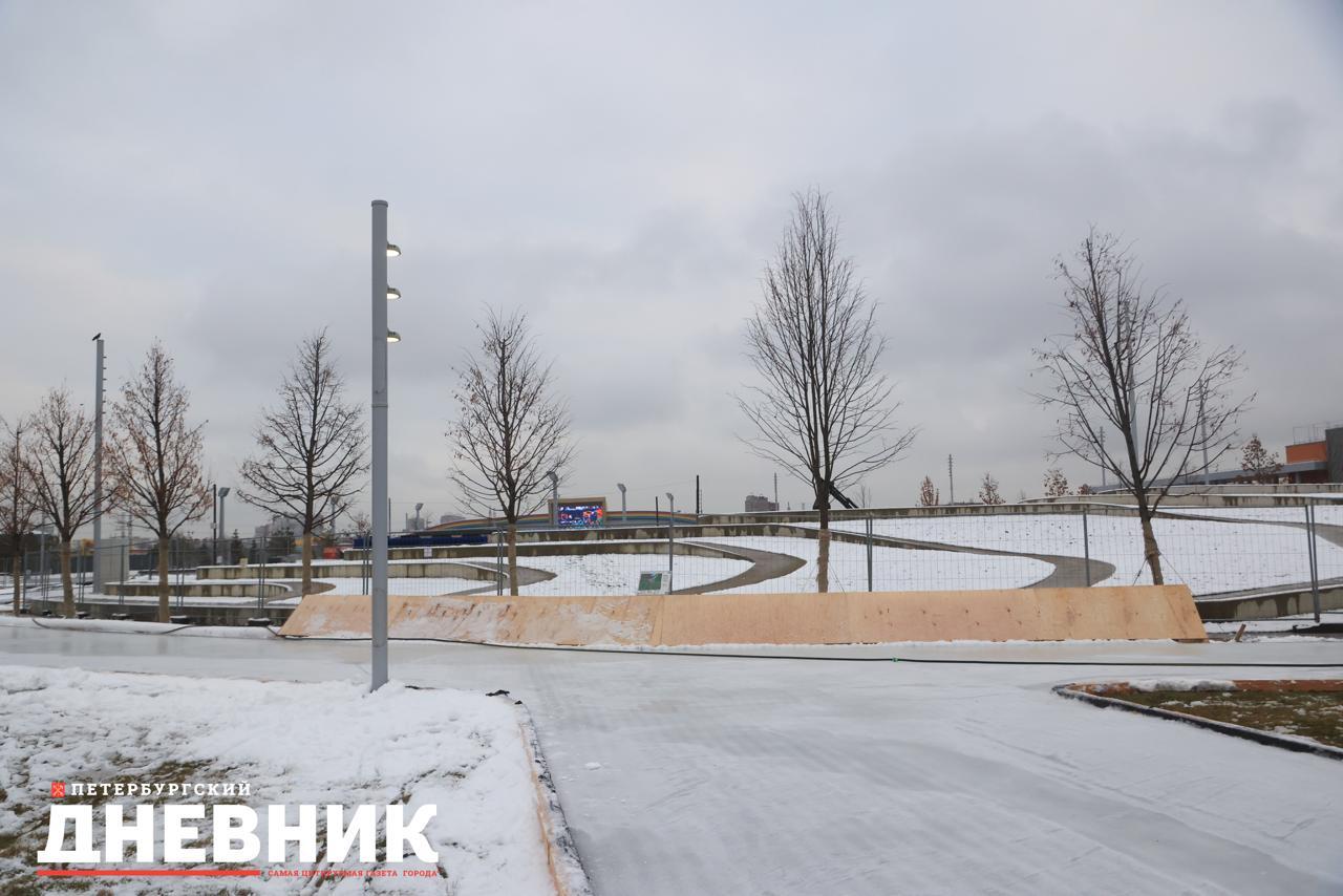 В Петербурге в воскресенье, 7 декабря, в 12:00 для горожан и гостей Северной столицы откроется уличный каток в парке у «СКА Арены». Фотограф «Петербургского дневника» Александр Глуз запечатлел, как подготавливают территорию: заливают лед, устанавливают защитные ограждения и расчищают снег.