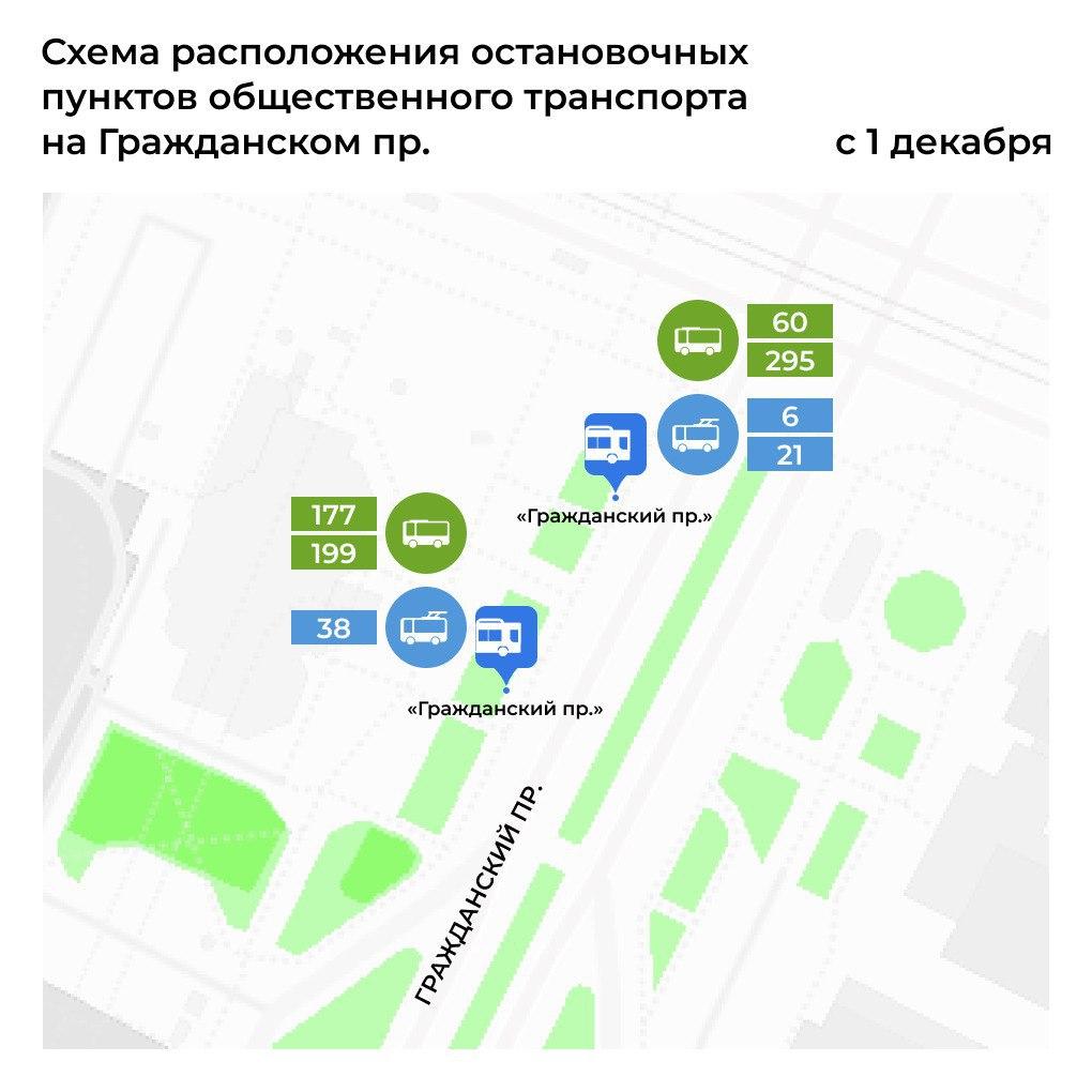 Изменения коснутся остановочного пункта, расположенного на Гражданском проспекте со стороны вестибюля метро. Место остановки будет разделено для высадки и посадки пассажиров автобусных маршрутов №№ 60, 177, 199, 295 и троллейбусных маршрутов №№ 6, 21, 38 в соответствии с их направлением движения.