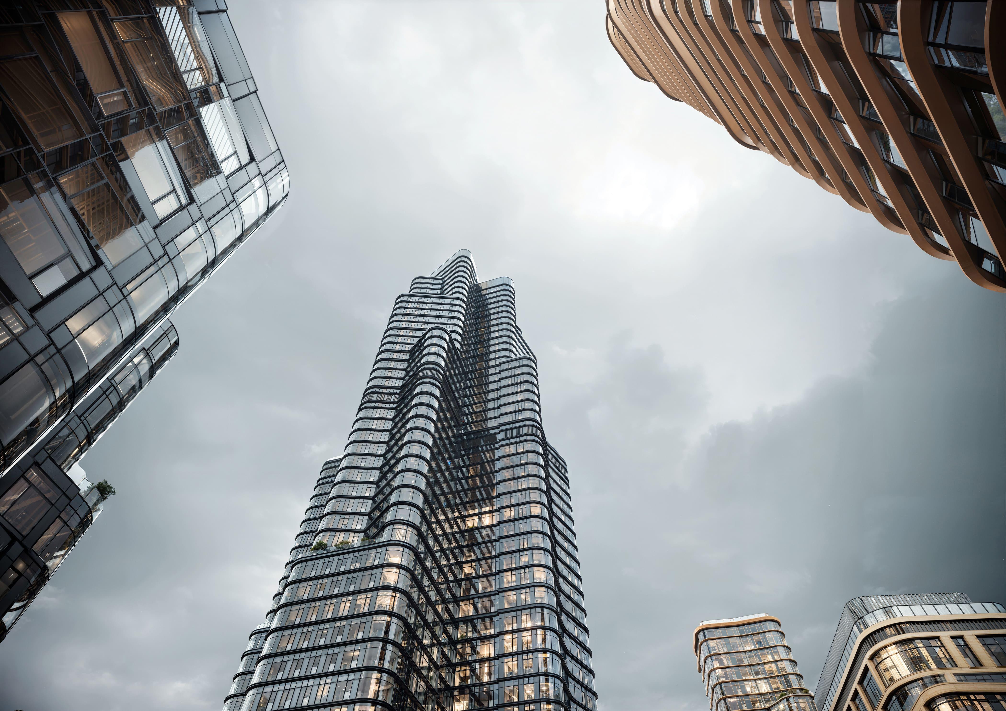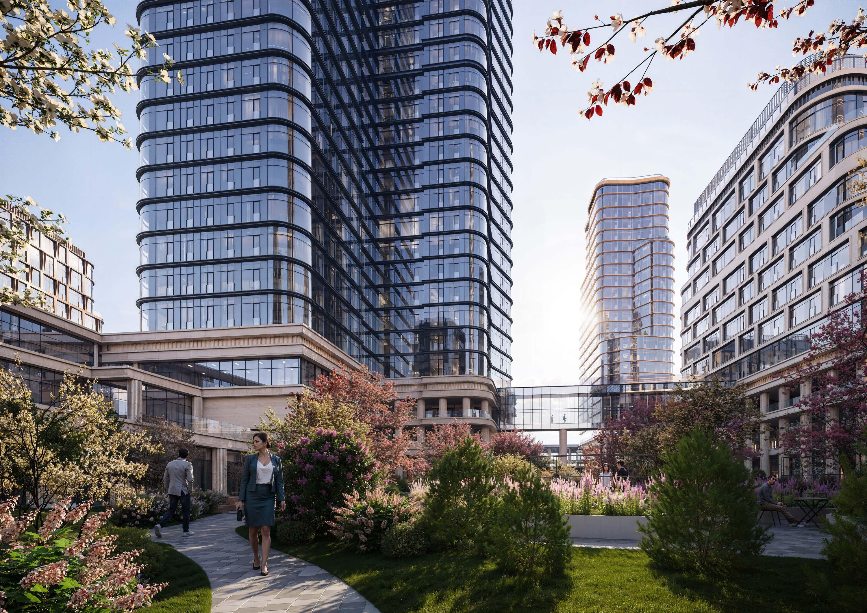 Большие площади остекления и уникальная витражная система отражают небо и городской ландшафт, визуально растворяя объемы зданий в пространстве. Использование известняка в облицовке добавляет проекту природной естественности и тактильной теплоты, что визуально сближает его со зданиями, находящимися рядом. Восемь корпусов переменной этажности (от 11 до 48 этажей) образуют сложную, но гармоничную композицию. Высотные доминанты проекта гармонично соседствуют с более низкой исторической застройкой Пресни, не создавая эффекта «стены».