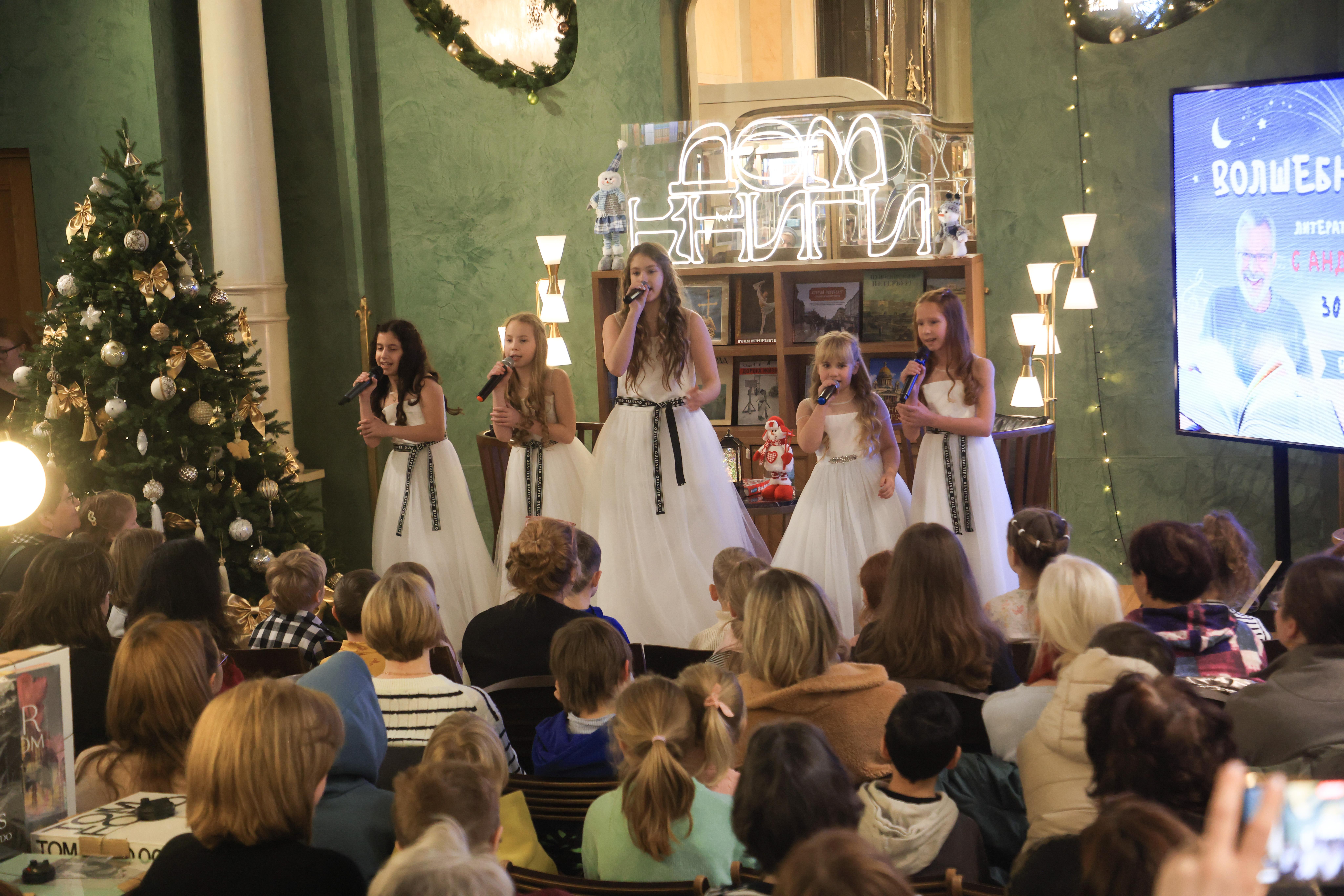 Музыкальную атмосферу вечера создала студия эстрадного вокала Елены Сахатовой. Выступление подарило гостям ощущение приближающейся зимней сказки.