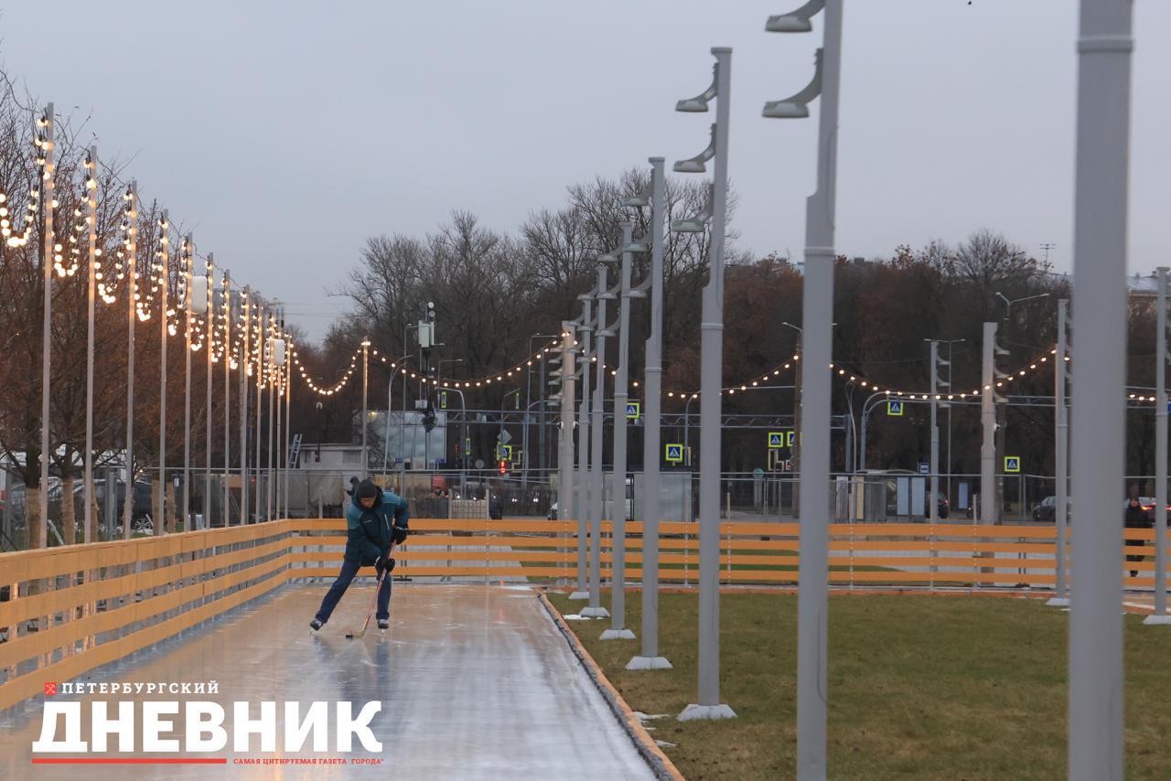 В парке у СКА Арены заканчивают подготовку к открытию нового зимнего катка: лед уже залили, ледовые машины вышли на обкатку, а по периметру загорелись праздничные огни. Специалисты впервые протестировали покрытие, а рядом продолжается монтаж новогодней елки – ее установят к официальному старту сезона, рассказали «Петербургскому дневнику» организаторы.