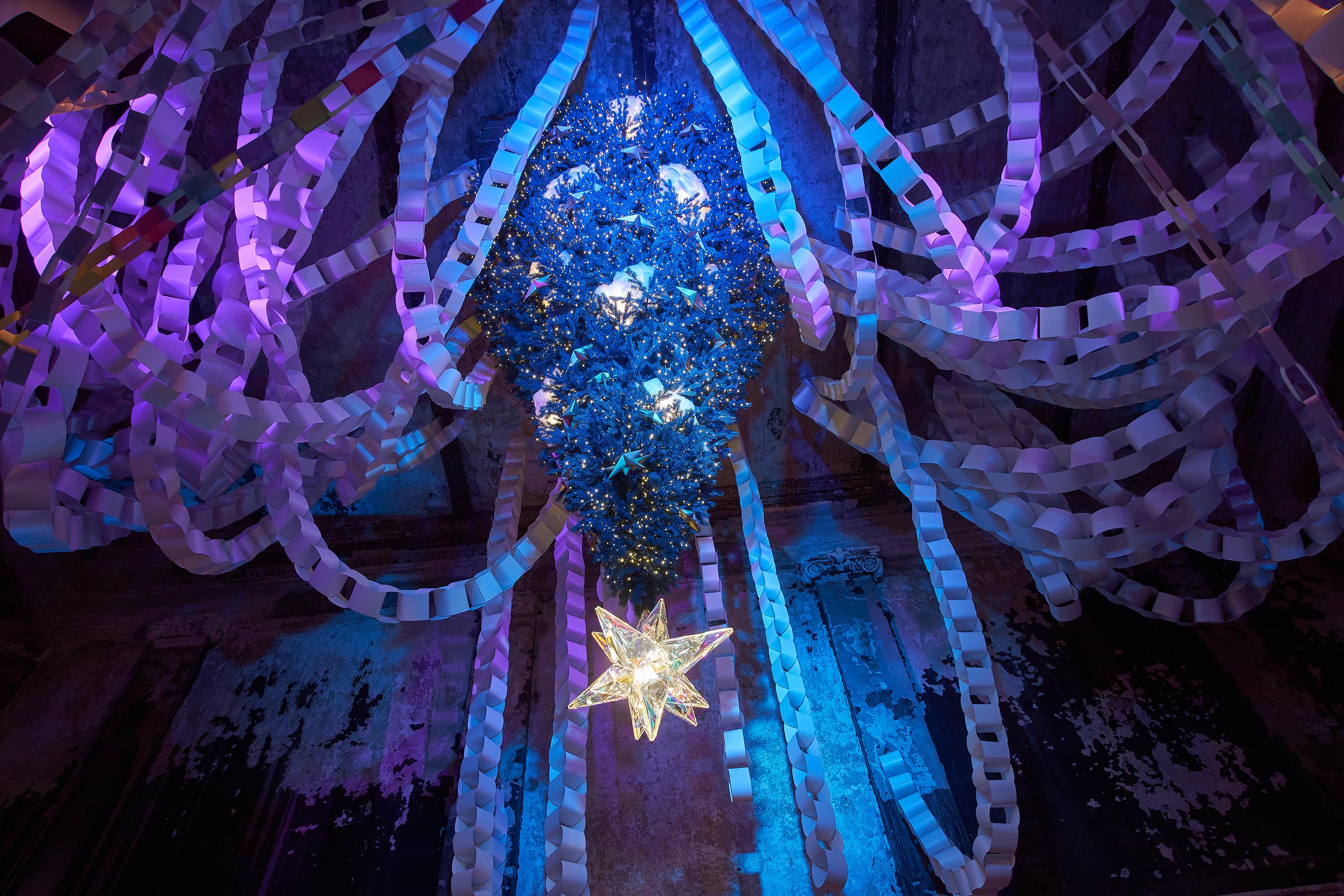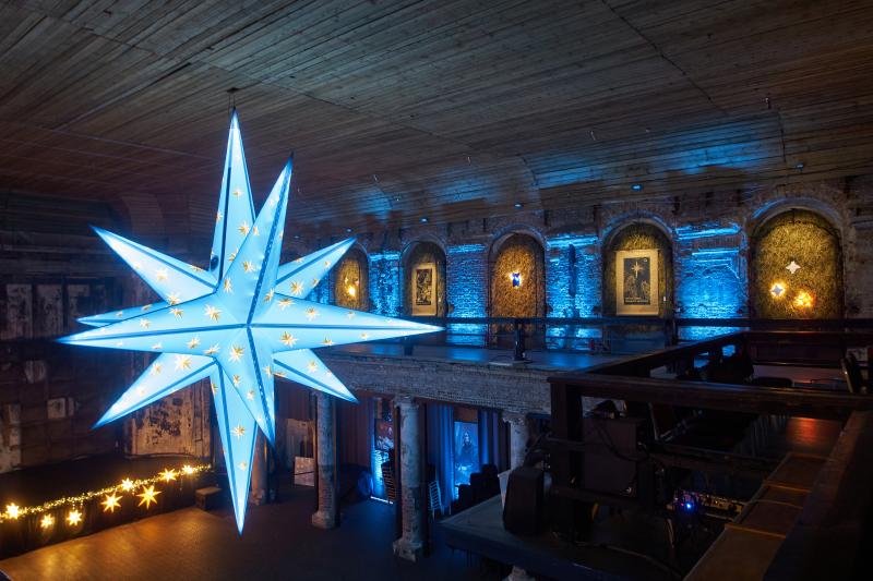 Первое дыхание выставки ощущаешь уже при входе в храм. Именно дыхание. Точнее – запах ели, который у большинства из нас неразрывно ассоциируется с Рождеством м Новым годом. Дальше уже на главной лестнице Анненкирхе посетителей встречает и она сама – главный символ Рождества, перевёрнутая по старой традиции, но с горящей звездой на верхушке. Вокруг – бумажные гирлянды, на изготовление которых ушло 1000 листов ватмана и месяц работы.