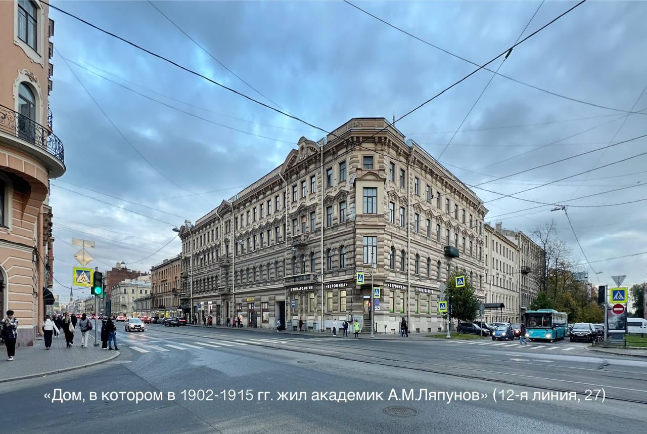 Дом, в котором в 1902–1915 годах жил академик А. М. Ляпунов (12-я линия В. О., 27);