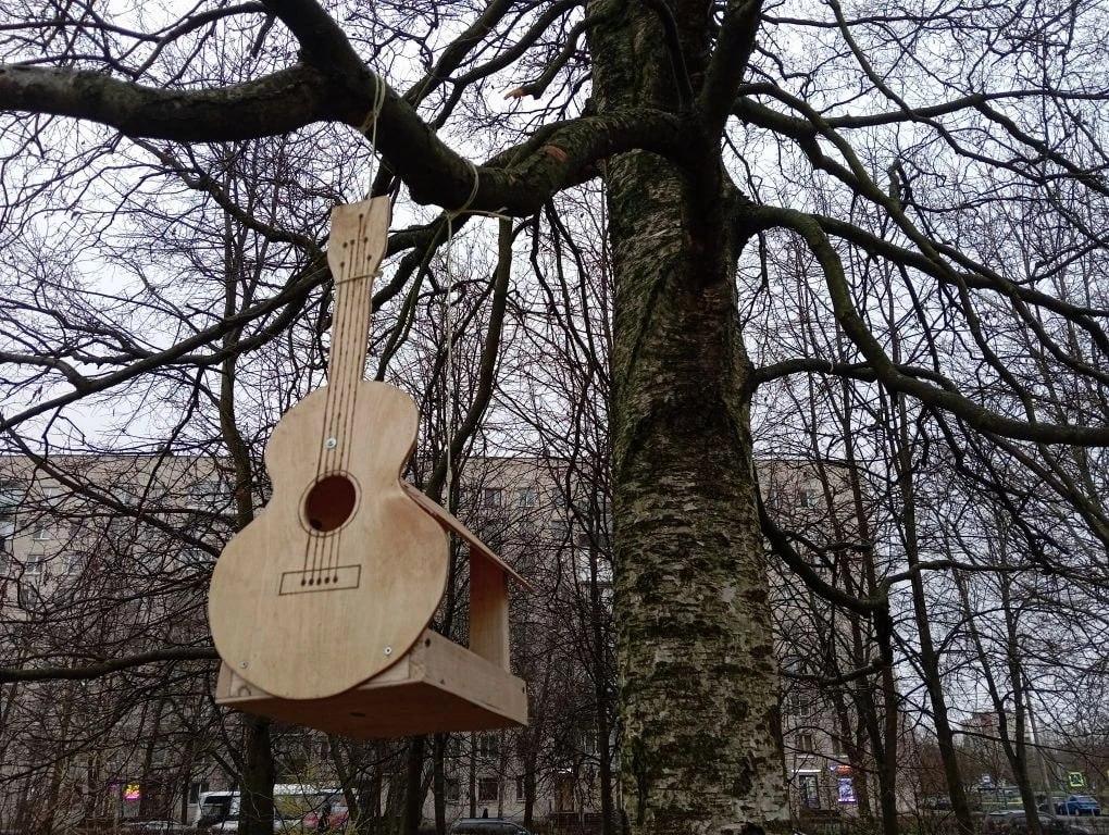 В сквере Виктора Цоя появились необычные кормушки и скворечники, дизайн которых поддержал музыкальную тему места: их боковые стенки выполнены в форме гитары.