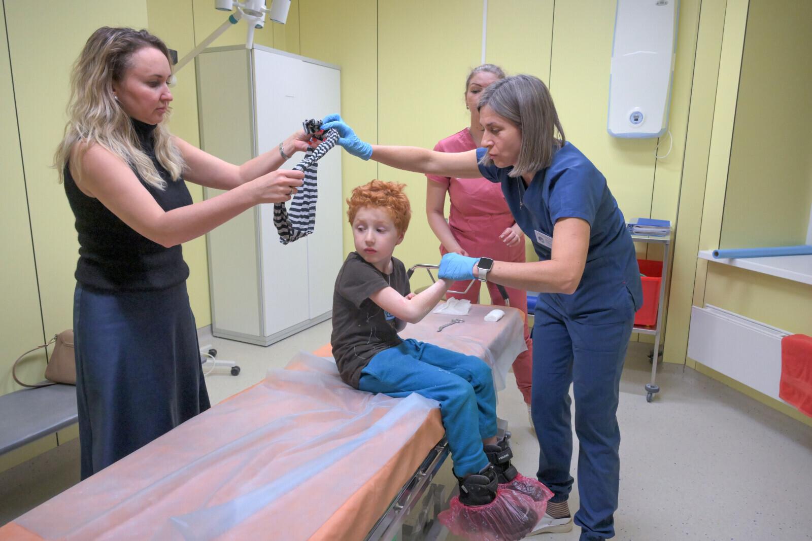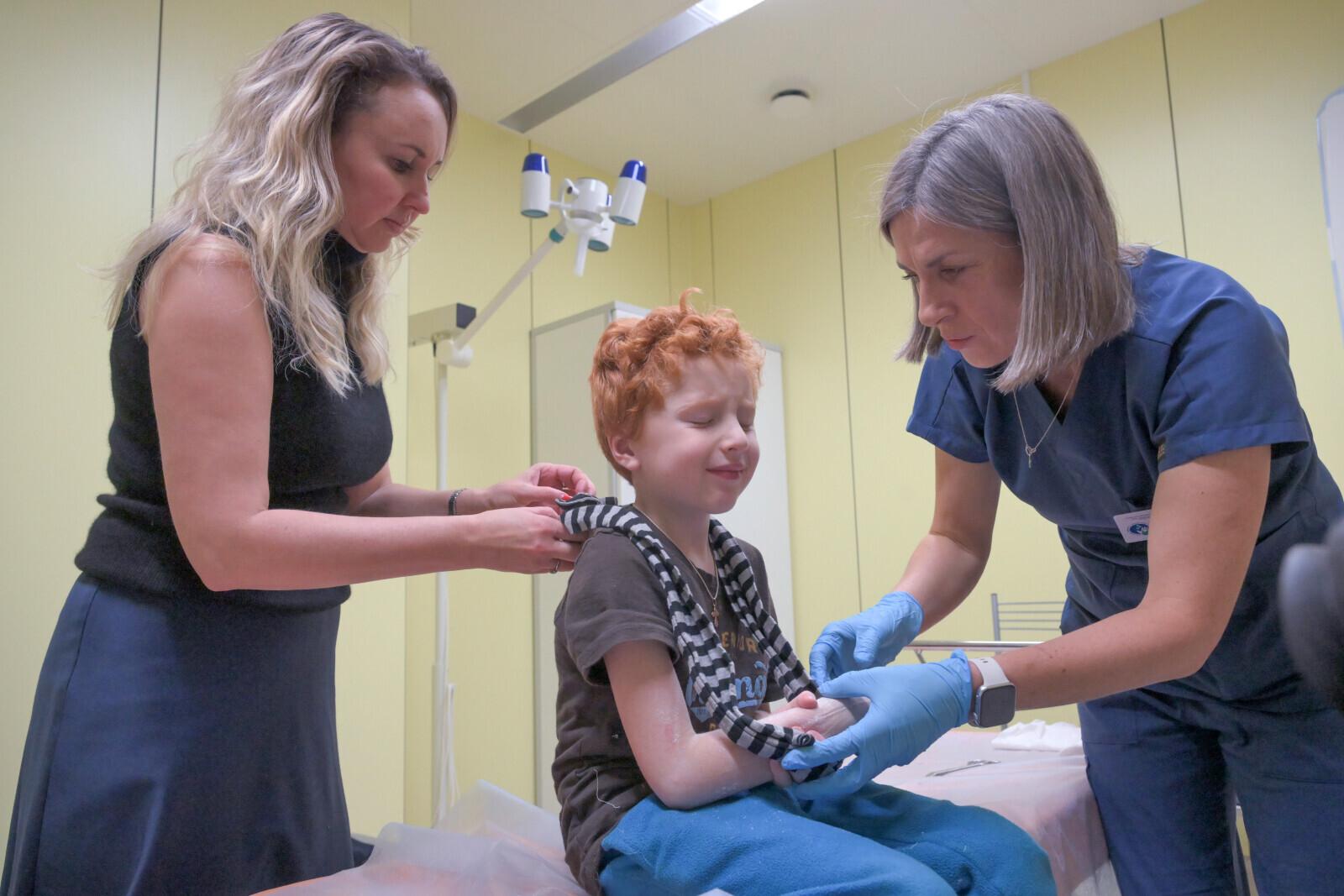 А вот маленькому рыжему Андрею сегодня повезло: ему сняли гипсовую повязку. Он месяц назад, тренируясь на футболе, сломал шейку лучевой кости руки. Через неделю повязку сняли, но боли не прошли. Тогда мама обратилась в КДЦ НМИЦ Турнера. Тут продолжили лечение мальчика. И вот сегодня врачи разрешили гипс снять, но на тренировку Андрея пока не пускают – надо, чтобы всё полностью срослось и зажило.