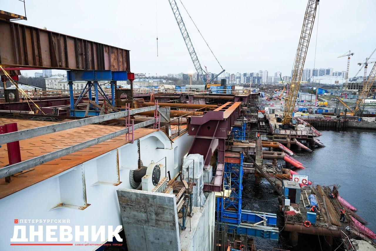 Для монтажа потребовались три буксира, ледокол и четыре мощных домкрата. Все операции заняли около 50 часов – в них участвовали порядка 80 специалистов. Сейчас на опорах установлены гидроцилиндры, которые будут приводить «крылья» моста в движение. Все оборудование произведено на Обуховском заводе.