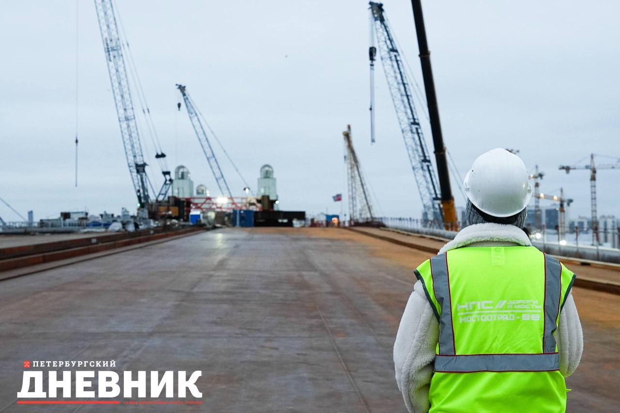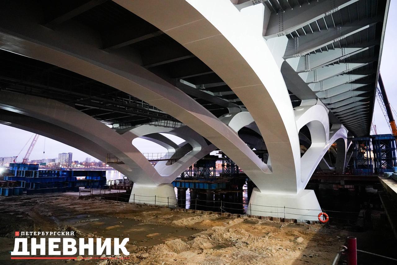 Стройка идёт сразу на нескольких участках: помимо самого моста, активно возводятся развязки на проспекте Обуховской Обороны, Октябрьской набережной и Дальневосточном проспекте. Работы ведутся круглосуточно.