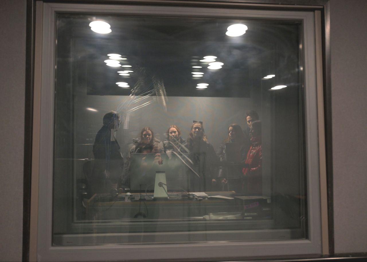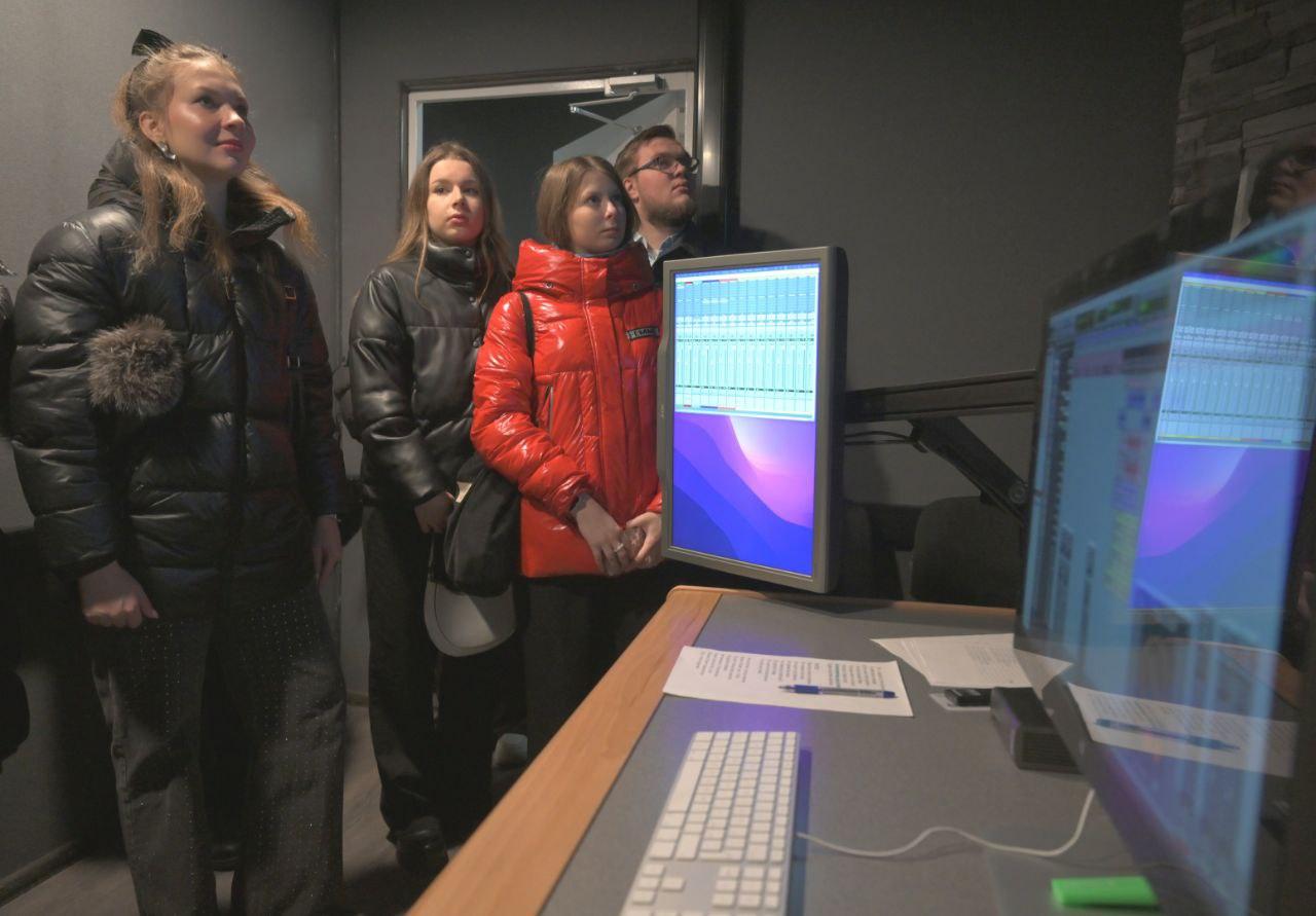 Больше всего студентов удивил 10-й корпус, в котором осуществляется постпродакшен – финальный этап в создании фильма, клипа или рекламного ролика. Молодые люди с интересом рассматривали многочисленные предметы и фактуры в цехе шумового озвучания, оценили технику в Тон-ателье № 2, где со звуком работают непосредственно актеры, побывали в цехе цветокоррекции.