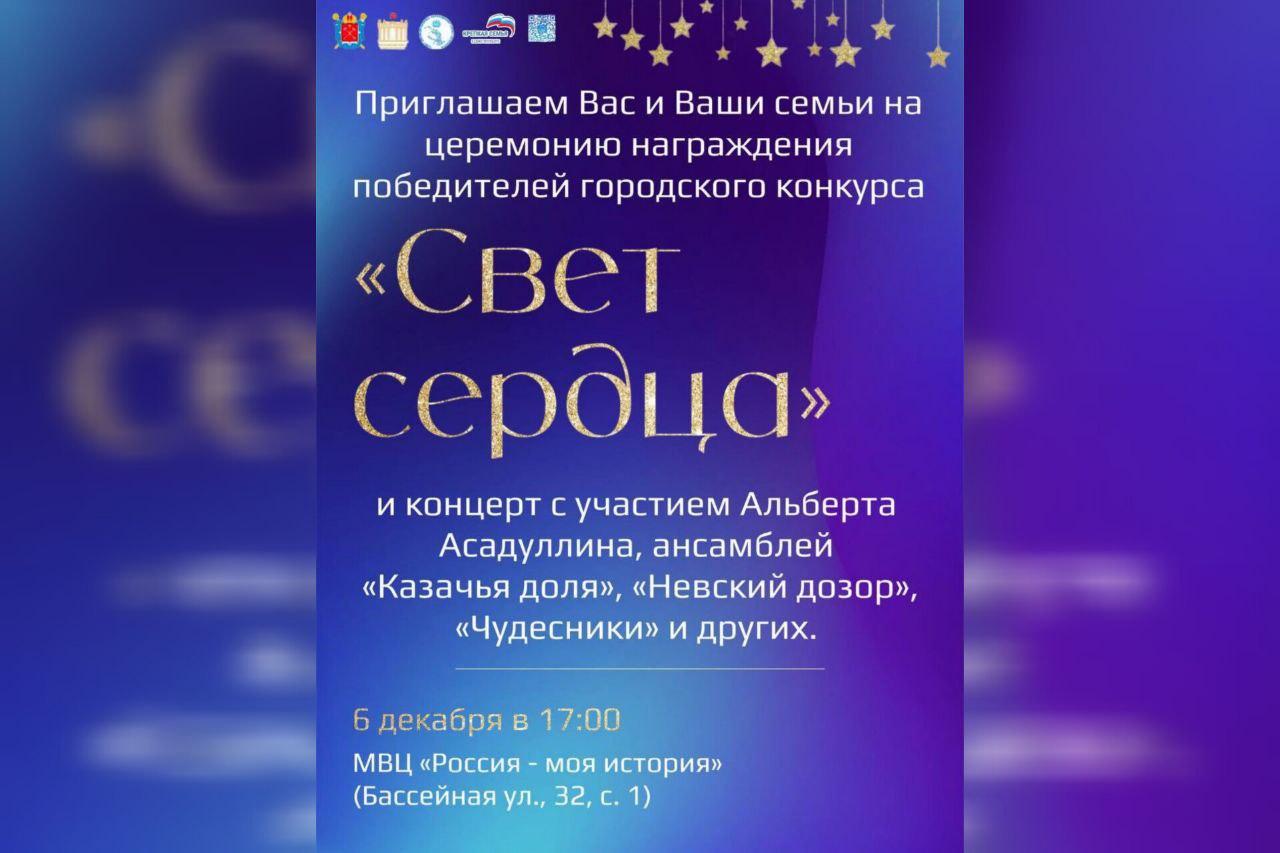 Завершит день в 17:00 церемония награждения конкурса «Свет сердца» для самых неравнодушных людей, помогающих семьям, и концерт с участием Альберта Асадуллина, ансамблей «Казачья доля», «Невский дозор», «Чудесники» и других. Участие бесплатное, регистрация обязательна, по ссылке.