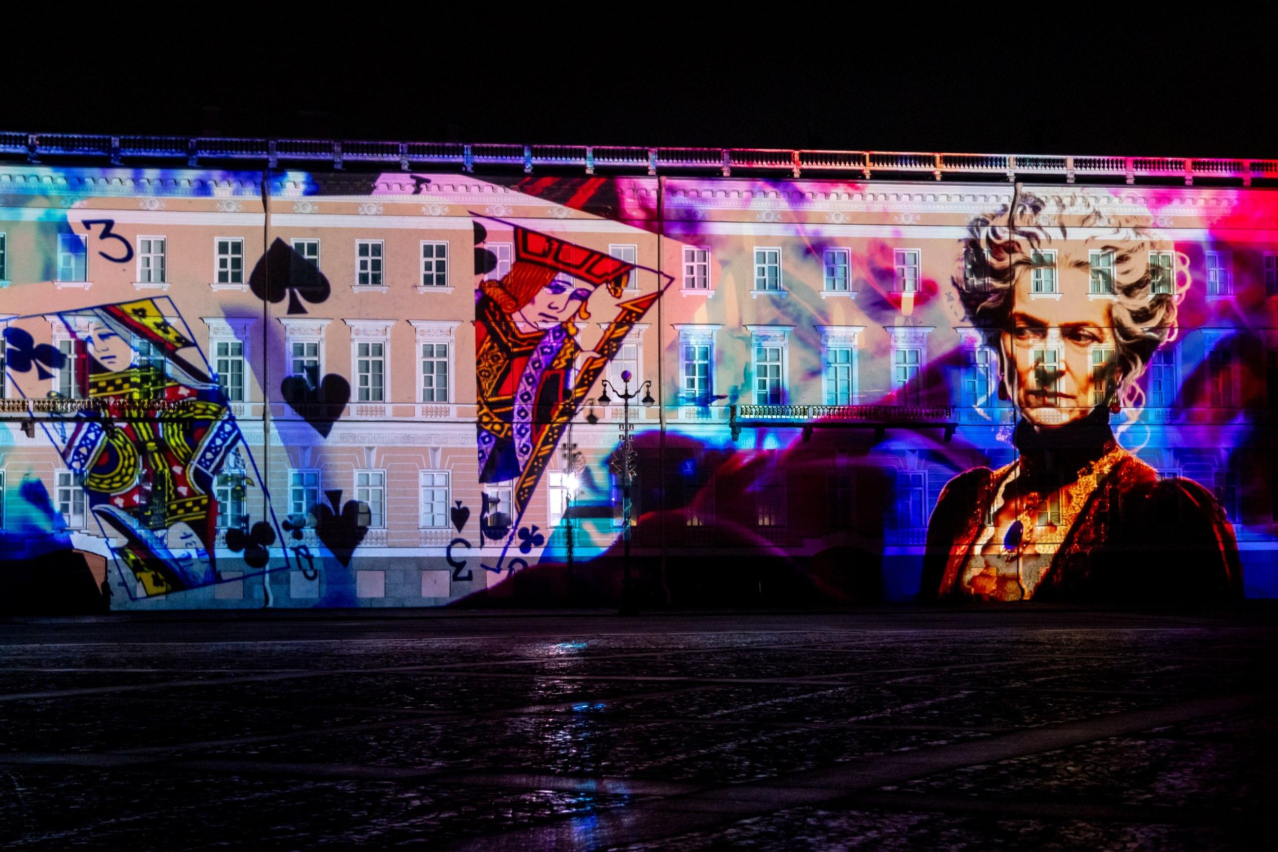 Фасады Главного штаба и Штаба гвардейского корпуса буквально ожили: свет, движение, музыка – все слилось в один гигантский кинофильм под открытым небом.