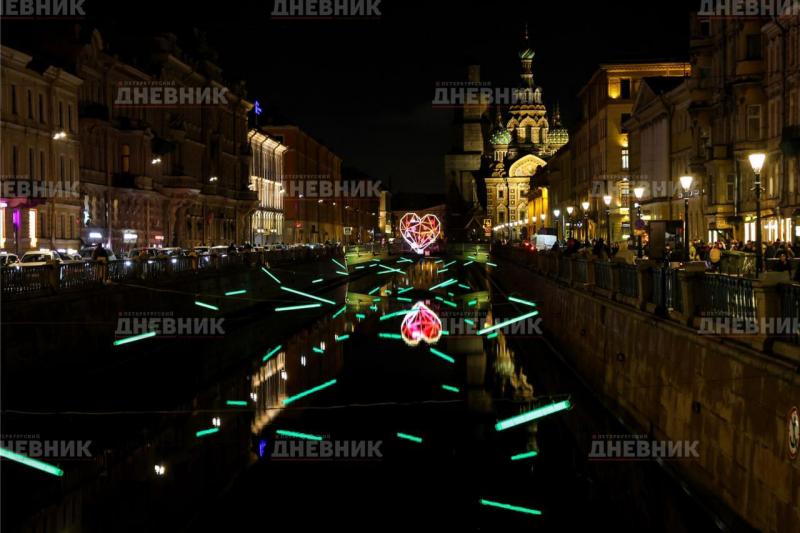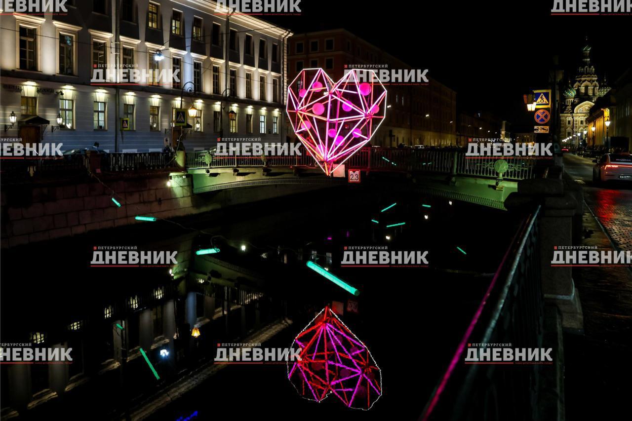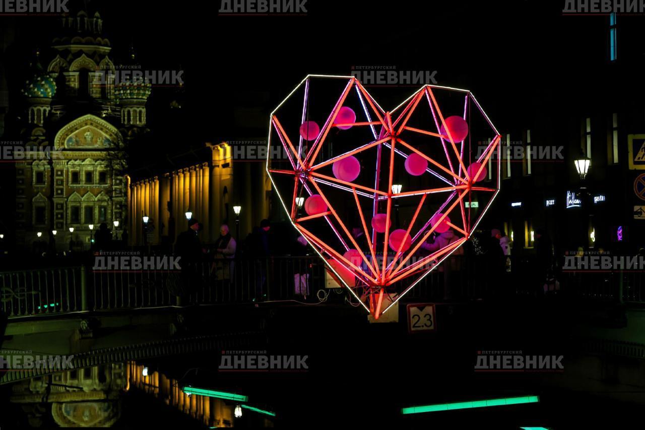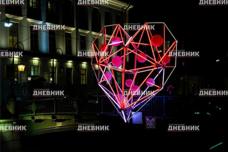 Фотокорреспондент «Петербургского дневника» запечатлел яркую световую инсталляцию в виде сердца. Она появилась на Итальянском мосту.
