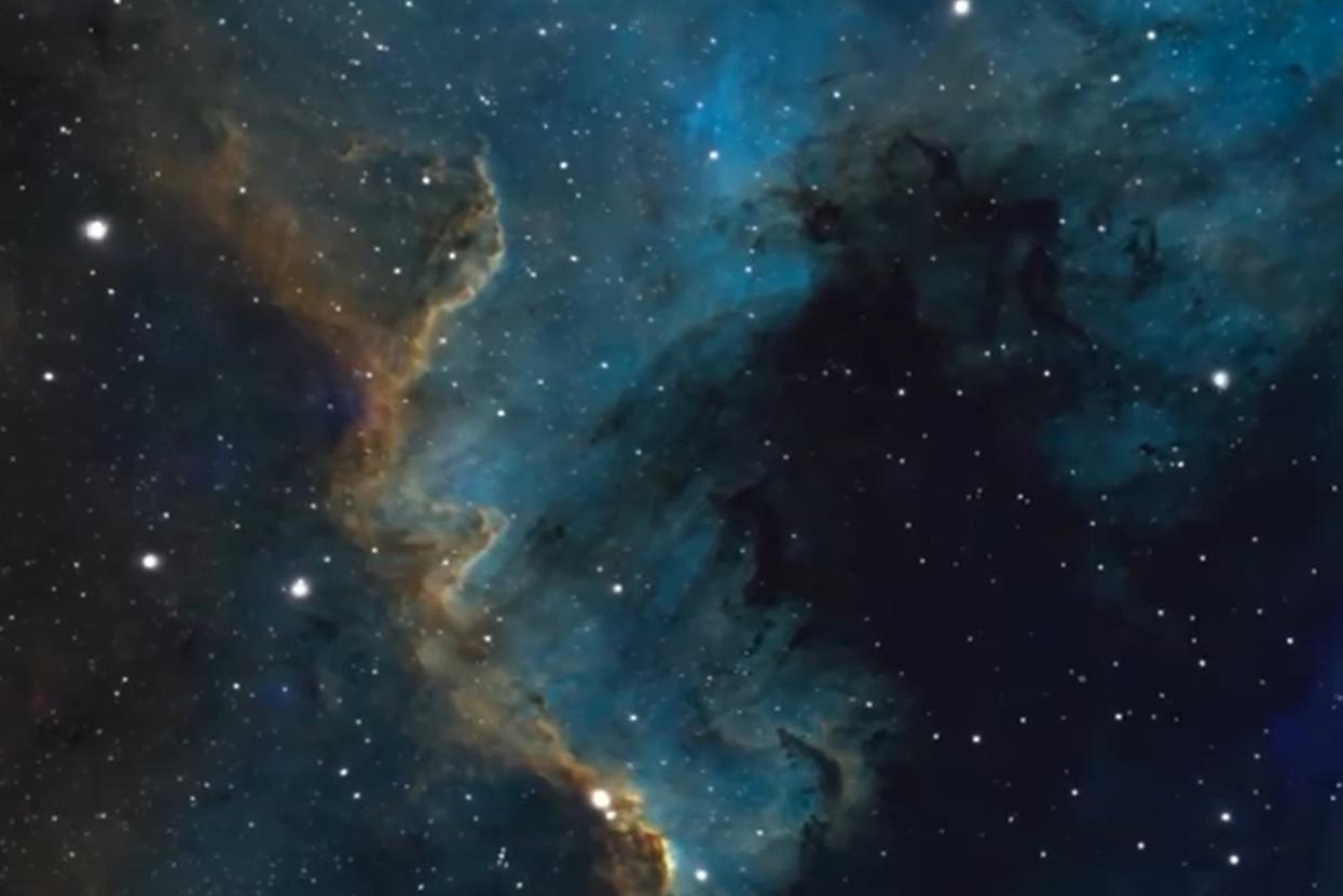Объект является частью эмиссионной туманности Северная Америка (NGC 7000) и получил своё название за поразительное сходство очертаний с континентом. На кадрах видно, как мощное излучение молодых горячих звёзд буквально высекает гигантские светящиеся структуры из холодного водорода, формируя космический рельеф, похожий на исполинский утёс. Этот динамичный процесс, напоминающий грандиозную стройку, происходит на расстоянии около 1500 световых лет от нашей планеты.