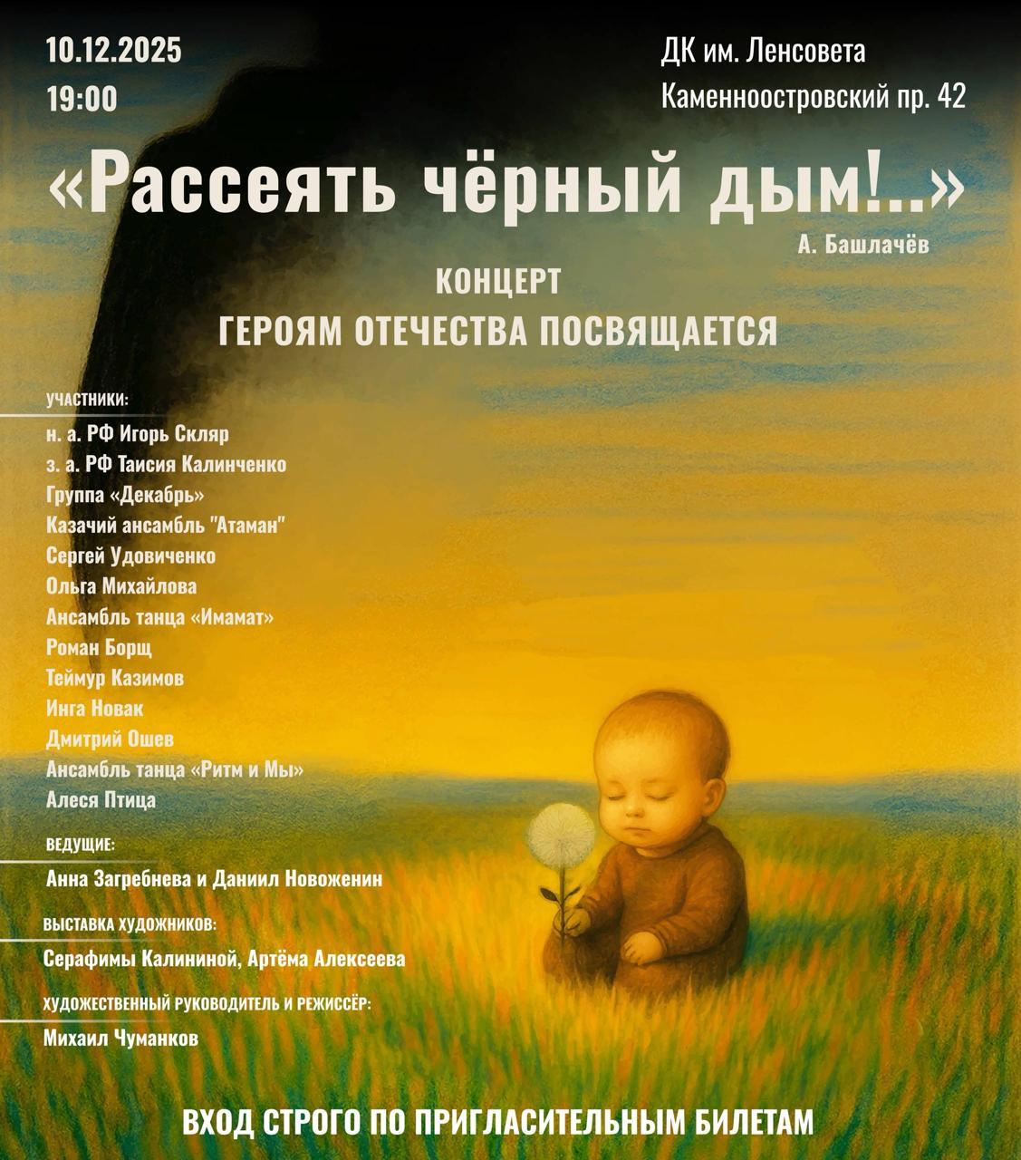 В среду, 10 декабря, в Санкт‑Петербурге состоится масштабный патриотический концерт «Рассеять чёрный дым…», посвященный героям России – тем, кто защищал и защищает суверенитет и мир в нашей стране. Название мероприятия вдохновлено строками Александра Башлачёва.