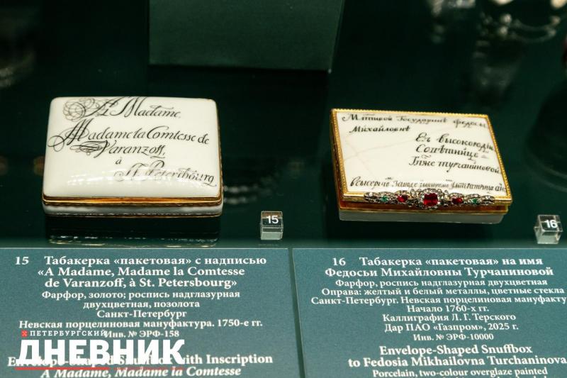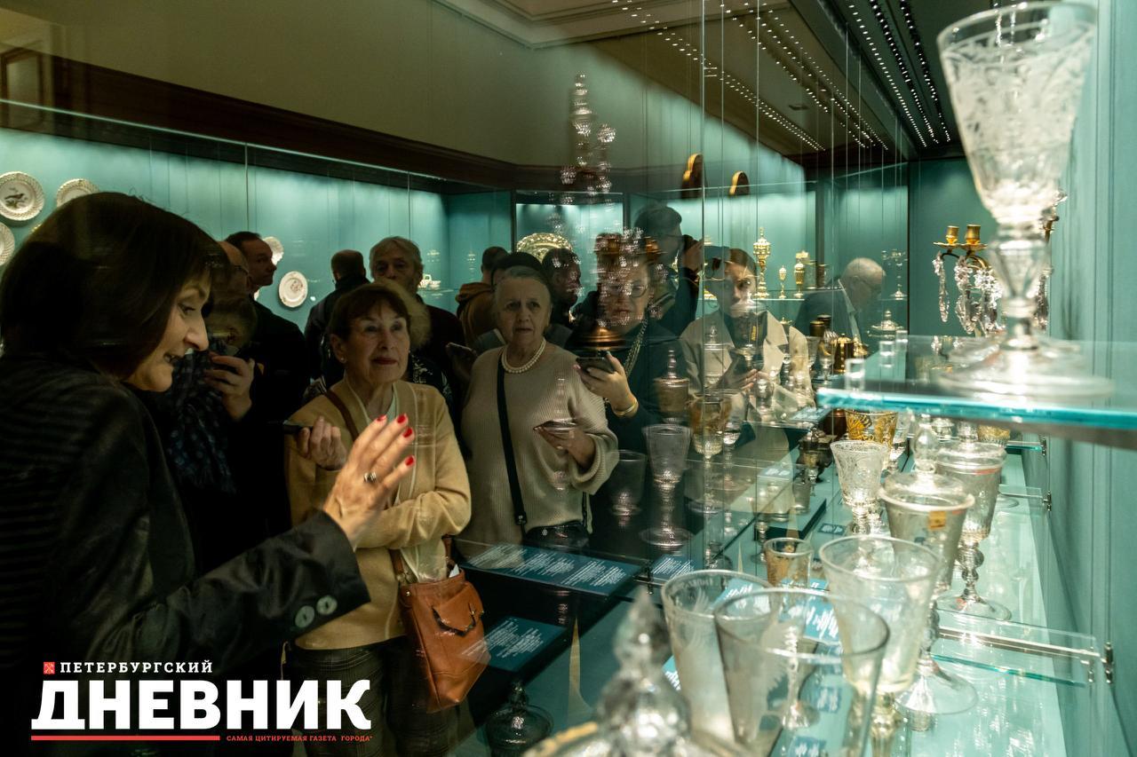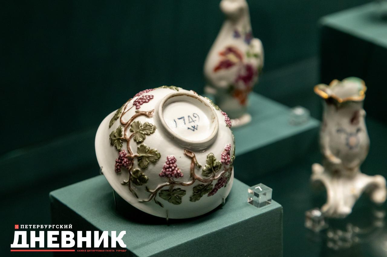 В новую выставку вошли богатейшие коллекции стекла и серебра «аннинского» и «елизаветинского» времени, а также знаменитый «виноградовский» фарфор. Первое, что видит посетитель, заходя в выставочный зал, – предметы, созданные на Невской порцелиновой мануфактуре (с 1765 года – Императорский фарфоровый завод): табакерки, флаконы, подсвечники, предметы из сервизных комплексов и многое другое. Особое место в коллекции занимает уникальное раннее творение основоположника русского фарфора Дмитрия Виноградова – чаша, украшенная рельефной гроздью винограда. На дне хрупкого изделия сохранилось личное клеймо мастера и дата «1749». Еще одной «изюминкой» экспозиции стали предметы из первого, изготовленного для императрицы Елизаветы Петровны, Собственного фарфорового сервиза.