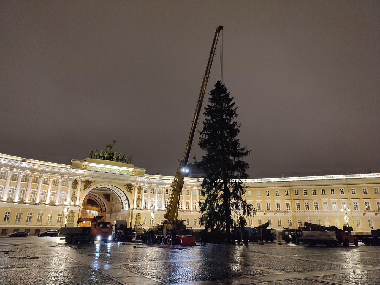 На Дворцовой площади в Петербурге установили Главную городскую елку. Ранее ночью ее доставили из Копорского лесничества Ломоносовского района Ленинградской области.