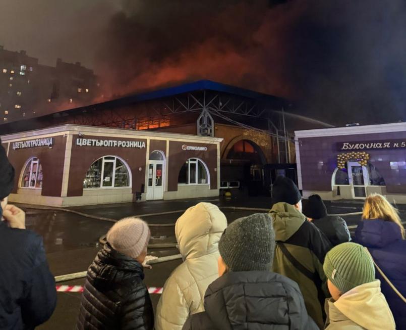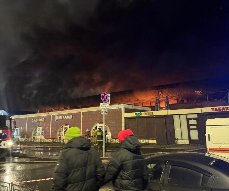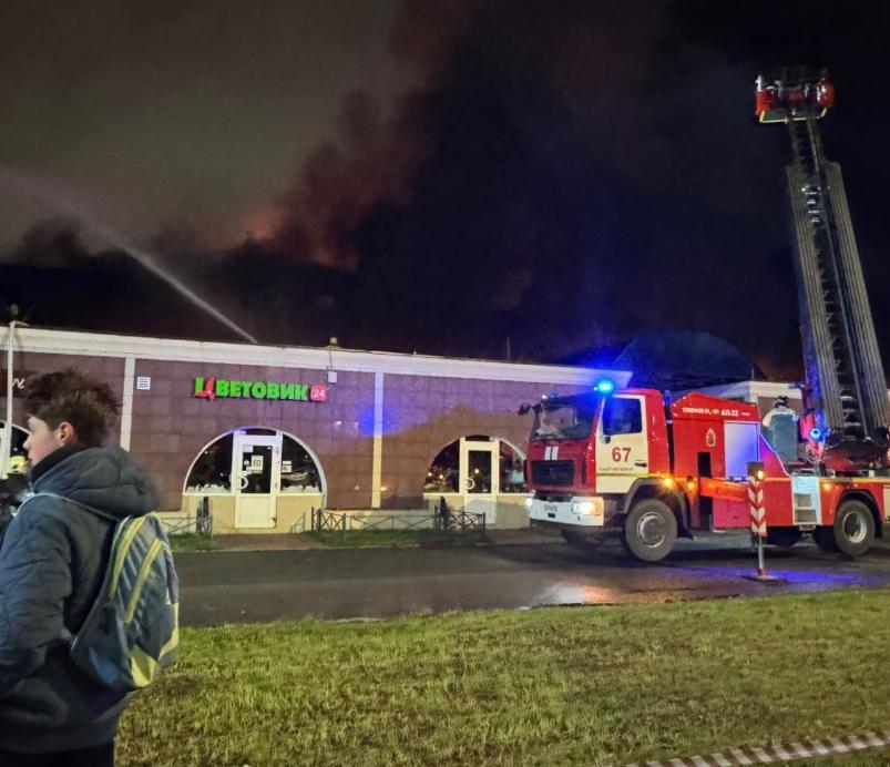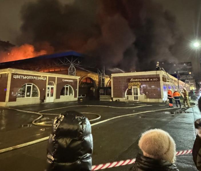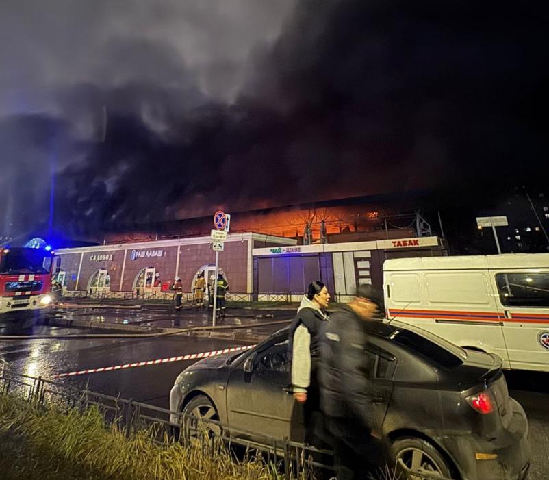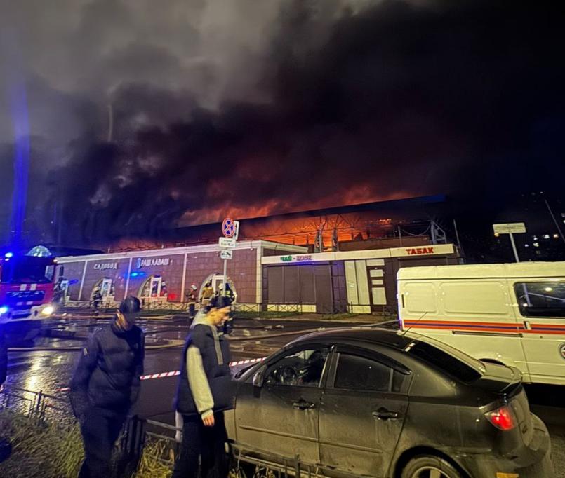 Появились кадры мощного пожара на Правобережном рынке в Петербурге