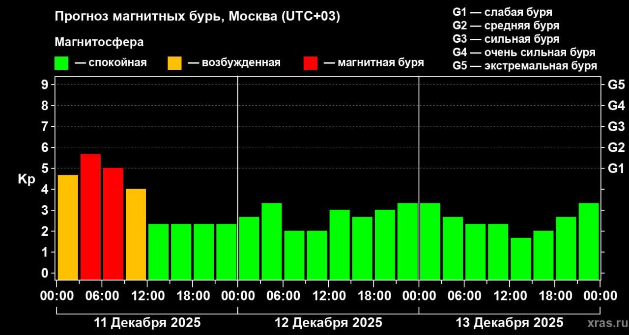 По прогнозам, буря продлится до середины дня, при этом временами уровень возмущений будет соответствовать магнитной буре интенсивностью от слабой до средней, G1–G2. Во второй половине дня магнитосфера Земли должна вернуться в спокойное состояние.