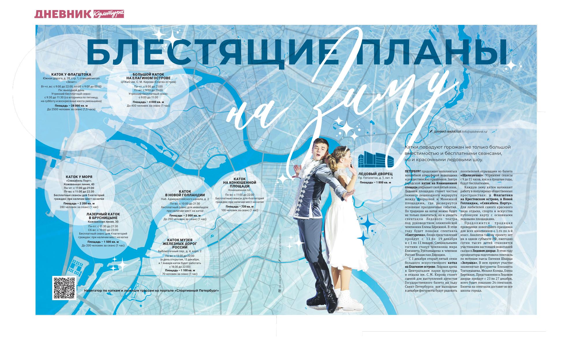 Петербург продолжает наполняться волшебной атмосферой новогодних и рождественских праздников. Завтра городской каток на Конюшенной площади открывает свой пятый сезон. Ледовая площадка станет частью зимнего пешеходного маршрута между Дворцовой и Манежной площадями, где развернутся основные праздничные события. По традиции на катке можно будет не только покататься, но и увидеть спектакли Ледового театра под руководством олимпийской чемпионки Елены Бережной. В этом году будет показан спектакль «Снегурочка», блоки представлений пройдут с 13 по 19 декабря и с 1 по 11 января. Специальными гостями станут чемпионка мира Елизавета Туктамышева и чемпион России Владислав Дикиджи.