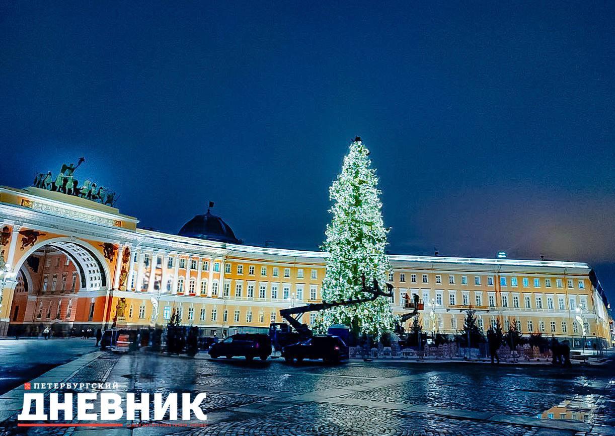 На Дворцовой площади уже в понедельник начали украшать главную новогоднюю ель. В этом году ее вновь оформляют в классическом стиле – с использованием флажков, серпантина и игрушек, знакомых по новогодним праздникам прошлых лет.