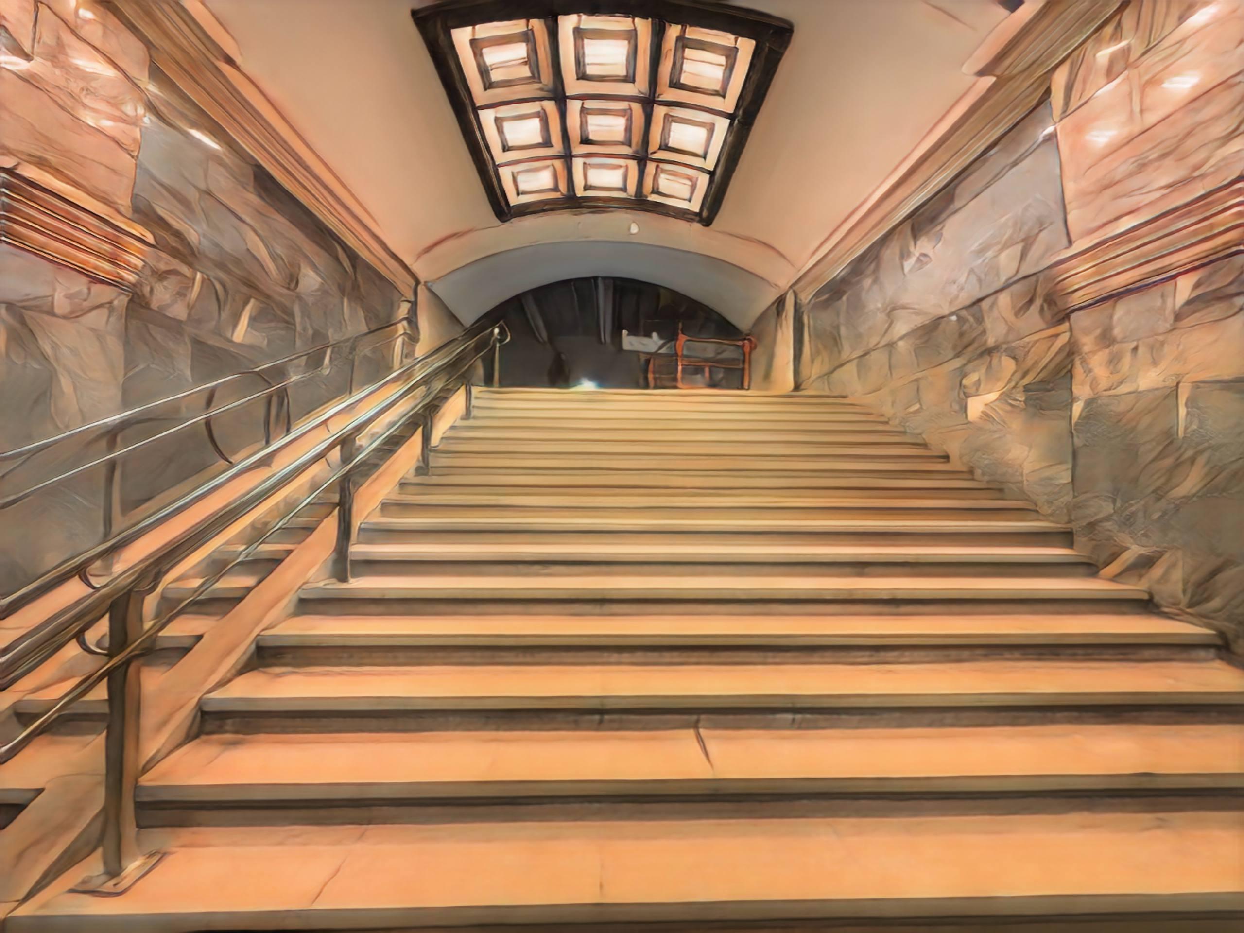 На участке от лестничного марша станции «Кировский завод» к малому наклонному ходу подрядчики выполнили значительный объём отделочных мероприятий: стены облицованы белым мрамором сорта «Коелга», завершена укладка напольного покрытия, установлены ступени из натурального камня.
