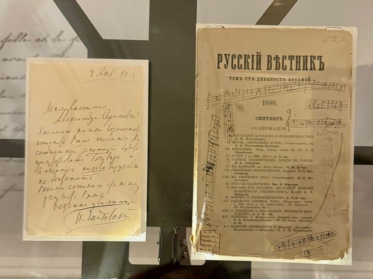 Внимание привлекает передовица «Русского вестника», на которой рукой Петра Чайковского написаны различные ноты. Он творил тогда, когда к нему приходило вдохновение, творил на любом попавшемся клочке бумаги. Такие экспонаты показывают, что композитор жил музыкой.