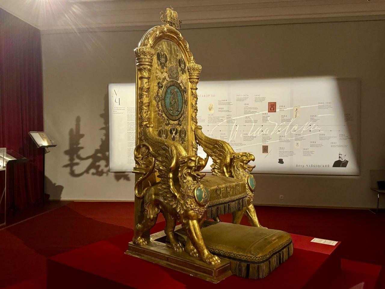 История взаимоотношений императора Александра III и Петра Чайковского начинается до их личной встречи. Связующим звеном выступила музыка. Александр Александрович, тогда еще Великий князь, заказывает у Чайковского увертюру на датский гимн к приезду своей невесты, датской принцессы Дагмар (Марии Федоровны). Так произошло их заочное знакомство. Позднее, по случаю коронации Александра III, композитору было поручено подготовить торжественную музыку. Он написал кантату «Москва» и «Коронационный марш». Эти ключевые моменты их еще не состоявшегося личного знакомства представлены на выставке троном, который участвовал в церемонии. Также уникальными свидетельствами знакомства являются экспонаты из музея Чайковского в подмосковном Клину – дирижерская палочка Эдуарда Направника, под чьим управлением состоялись премьеры практически всех создававшихся в то время русских опер, и его перчатки.