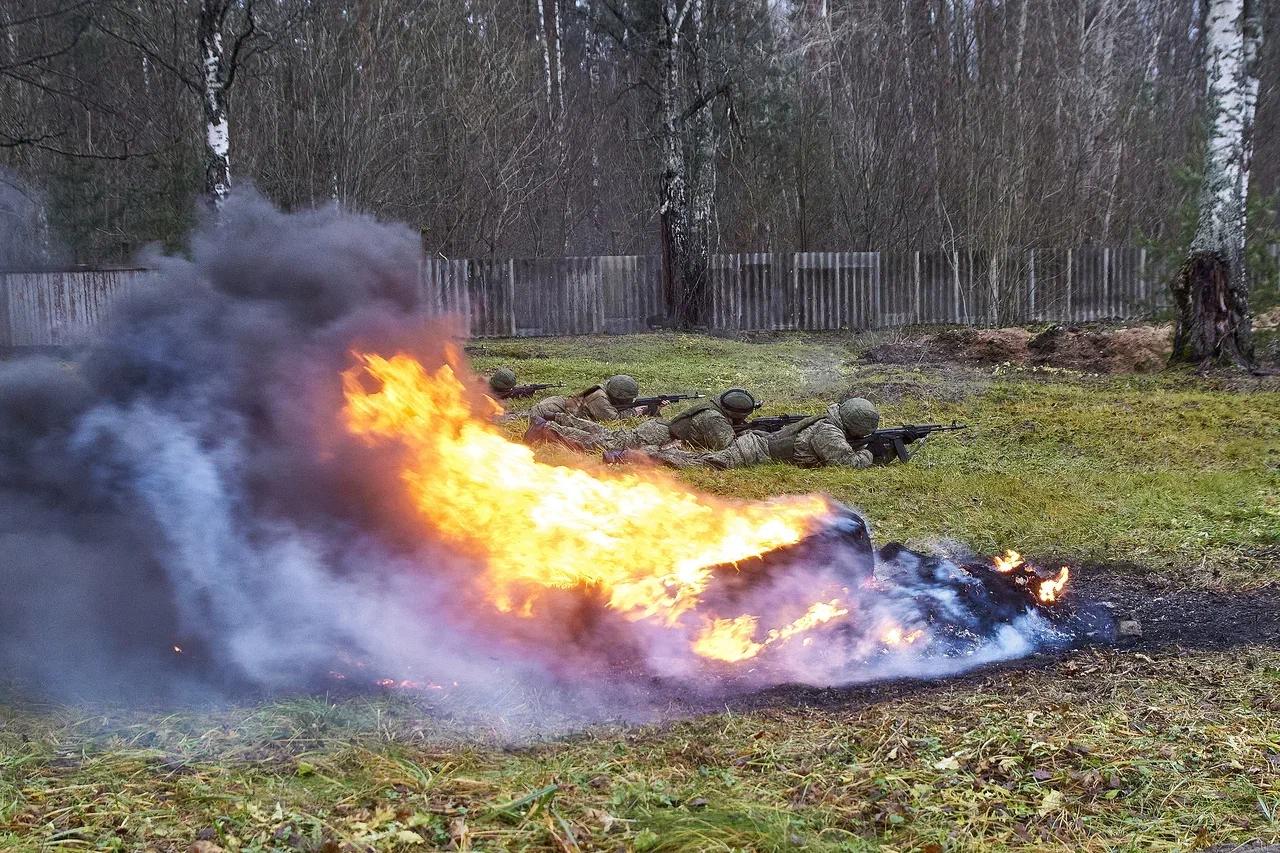 Отработка навыков реального управления дроном проходит тут же на небольшом полигоне рядом с учебным корпусом. Весь процесс моделирует работу расчёта БПЛА в условиях боевых действий – от получения задачи до поражения учебной цели. От слаженности и навыков на фронте будет зависеть жизнь. Проходят считаные секунды, и квадрокоптер с имитатором выстрела от РПГ с жужжанием взмывает в небо. Ради нашего визита в качестве цели решили использовать гирлянду воздушных шаров. Сильный ветер мотает её из стороны в сторону: то прижимает к земле, что поднимает вверх. Первый заход – мимо. Дрон разворачивается, и со звуком взбешённой осы бросается в новую атаку. И снова промах. Только с третьего раза один из шаров лопается. И дело тут не в неумении оператора – это инструктор с реальным боевым опытом. Просто, по его словам, цель «мотыляло» так, как не бывает на практике.