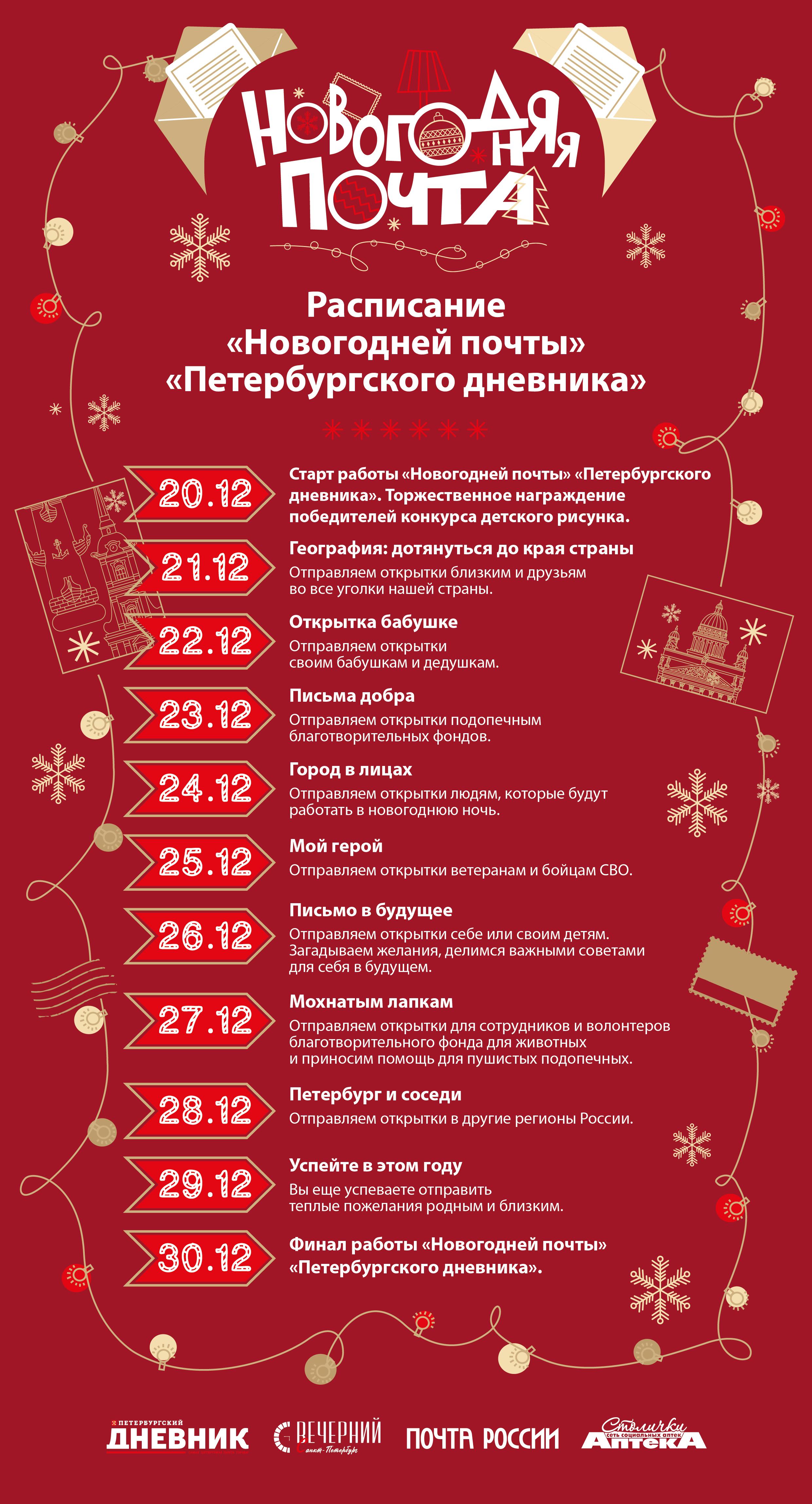 В рамках проекта все желающие могут бесплатно отправить новогодние открытки из самого сердца Петербурга, а «Почта России» бесплатно доставит их в любую точку нашей страны. «Новогодняя почта» «Петербургского дневника» – совместный проект издания «Петербургский дневник», «Почты России» и газеты «Вечерний Санкт-Петербург».