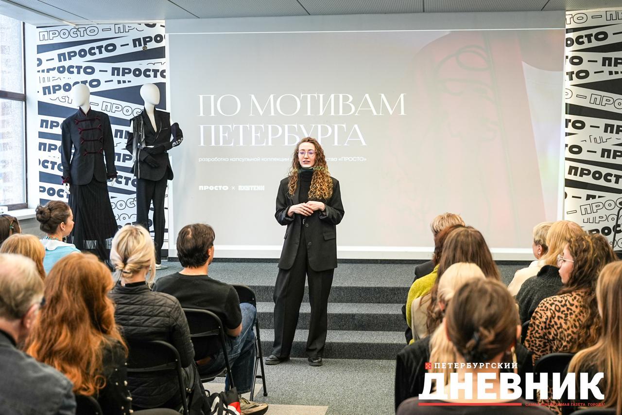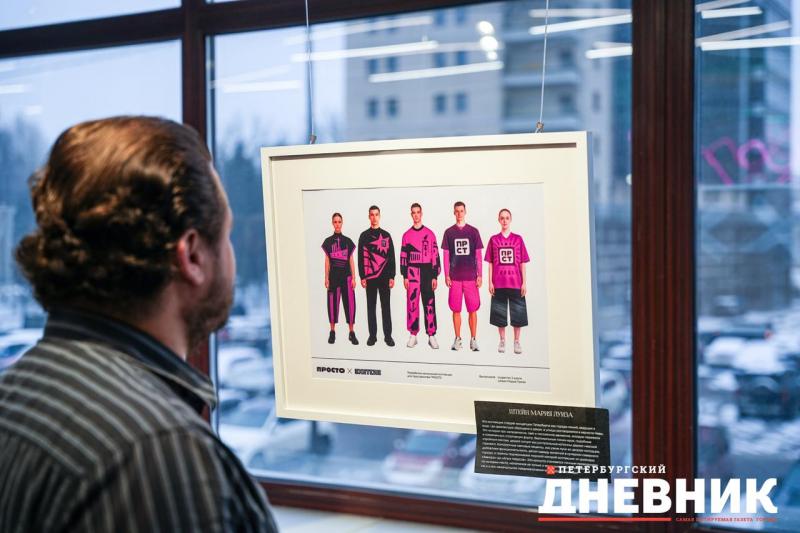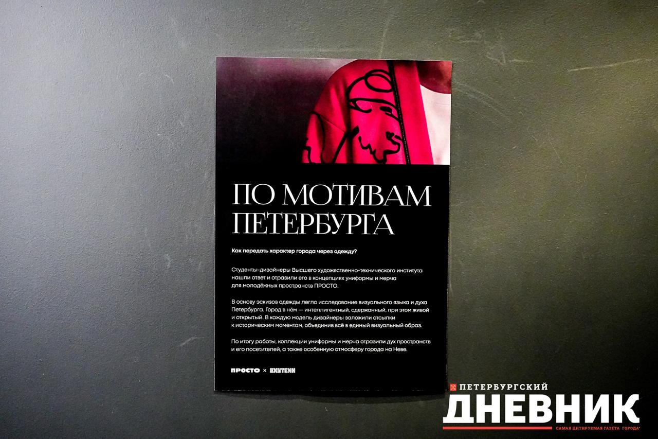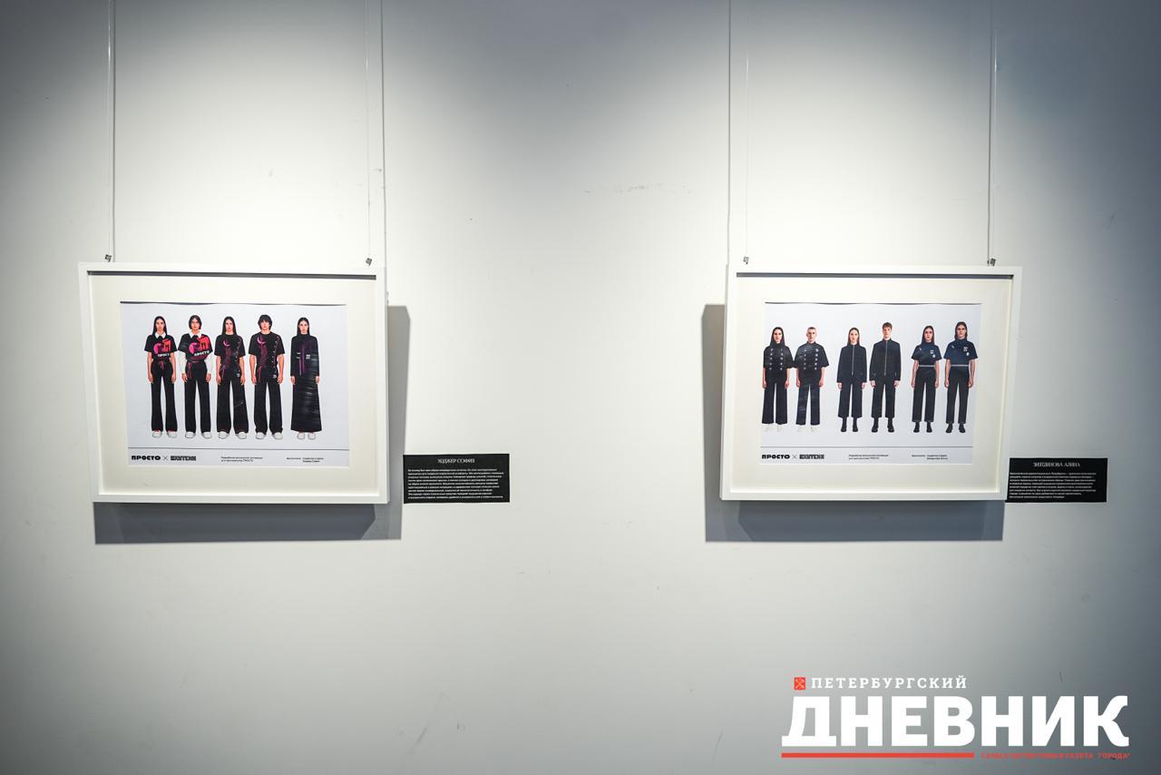 Основой экспозиции стали работы студентов факультета дизайна Высшего художественного-технического института. Совместно с Государственным музеем истории Санкт-Петербурга они создали проект, в рамках которого в течение полугода с приглашенными экспертами разрабатывали концепции униформы для администраторов молодёжных пространств «ПРОСТО». Одной из главных задач стало стремление передать характер Петербурга – интеллигентного и сдержанного, но при этом живого и открытого.