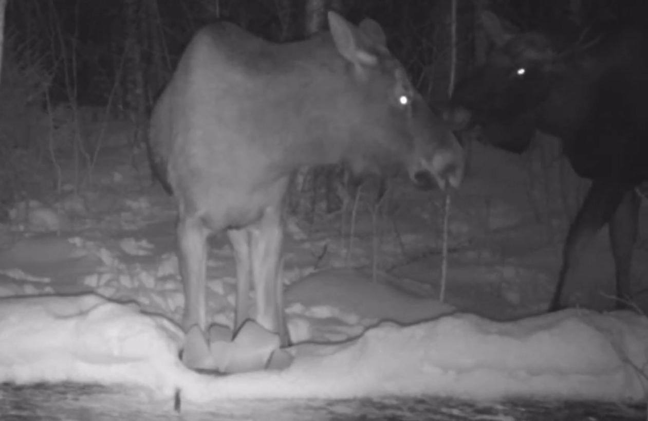 Дело происходит ночью. Сначала гиганты мирно паслись на расстоянии. Их общение наполнено пощелкиваниями и стонами. Затем один из лосей, более светлого окраса, смело приблизился вплотную к объективу.
