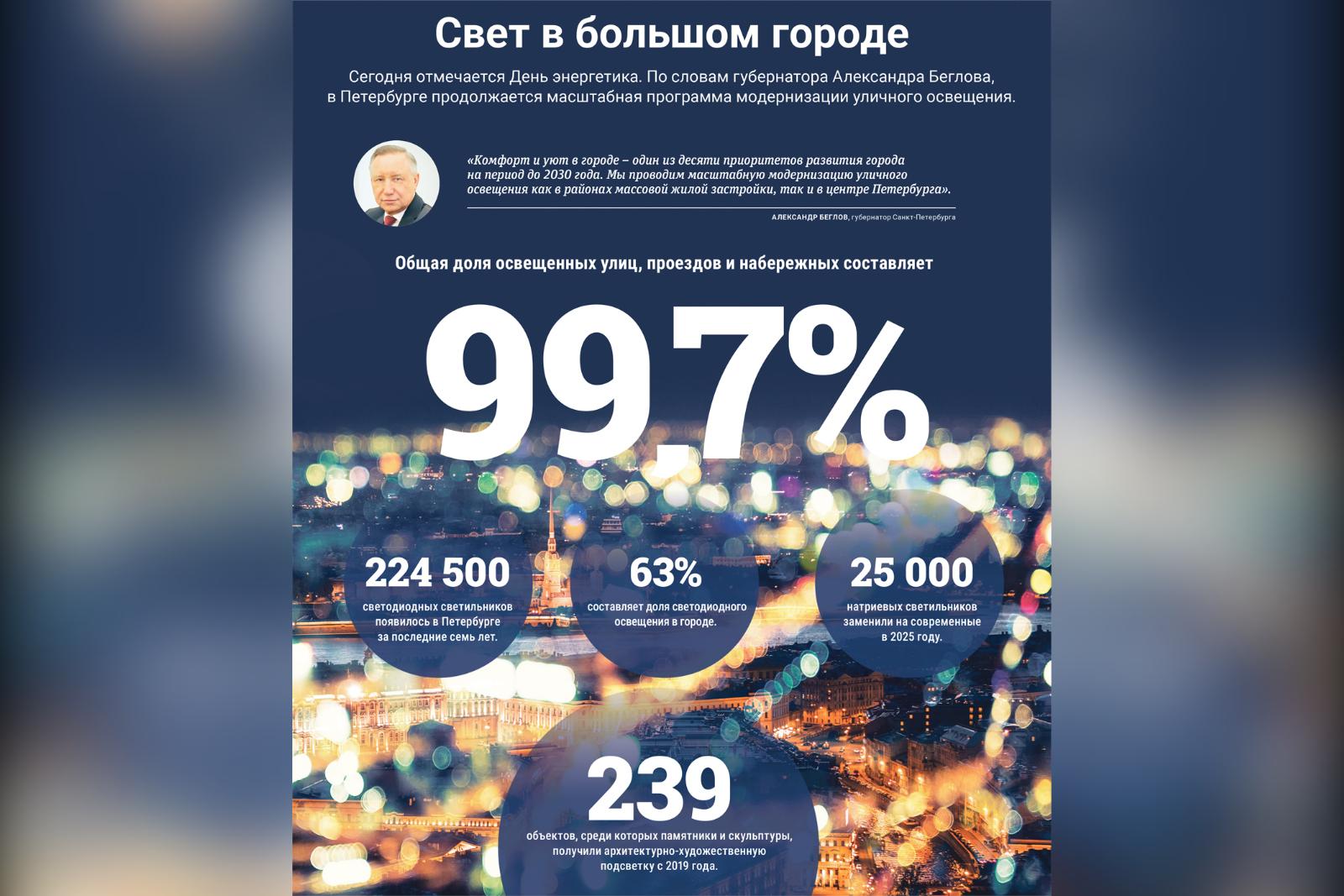 Общая доля освещенных улиц, проездов и набережных составляет 99,7%. 224 500 светодиодных светильников появилось в Петербурге за последние семь лет.