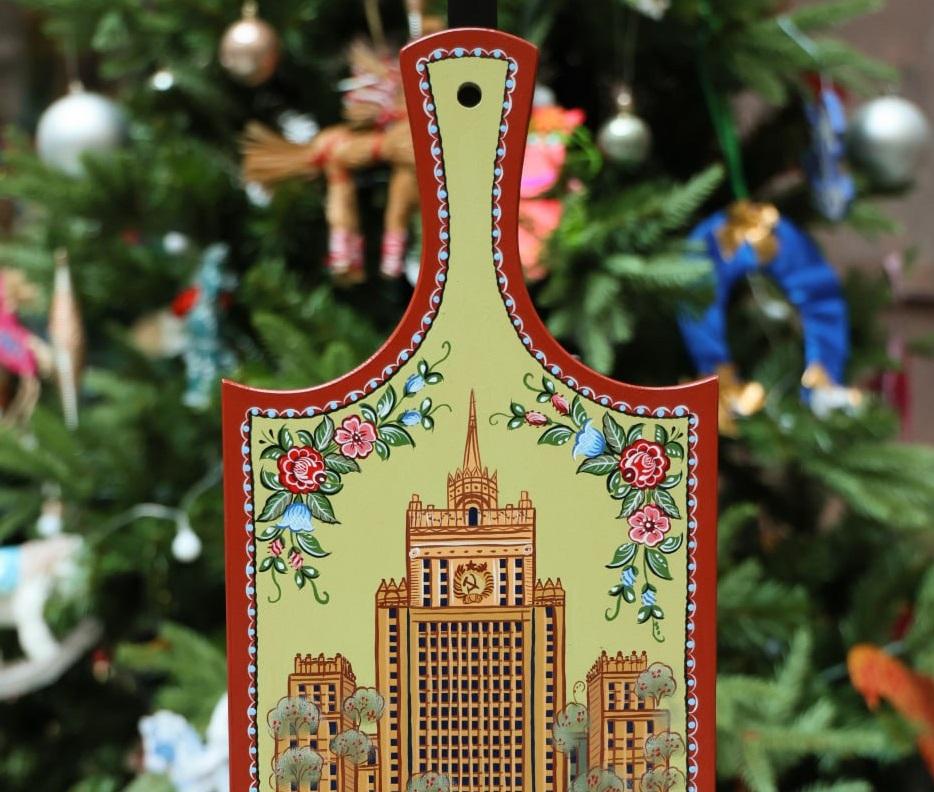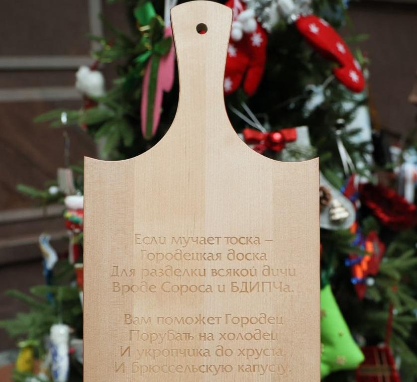 На лицевой стороне подарочной доски изображено главное здание МИД, а на оборотной – добрые частушки на злобу дня. Каждое изделие по своему уникально и является ручной авторской работой.