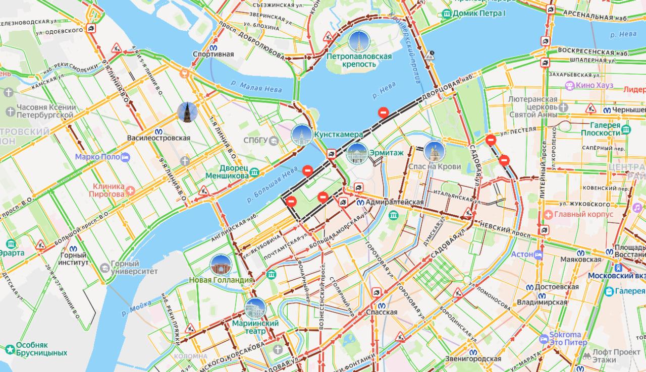 Судя по данным сервиса «Яндекс. Карты», в городе восьмибалльные пробки. В центре Северной столицы произошло сразу несколько ДТП, которые привели к увеличению транспортных заторов.