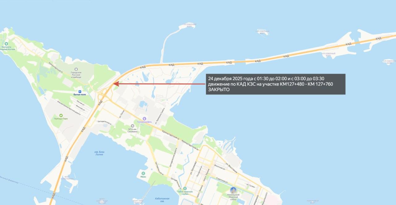 «В период с 01:30 до 02:00 и с 03:00 до 03:30 24 декабря 2025 года – полное перекрытие движения по внутреннему и внешнему кольцу КАД КЗС на участке КМ 127+480 – КМ 127+760», – говорится в сообщении.