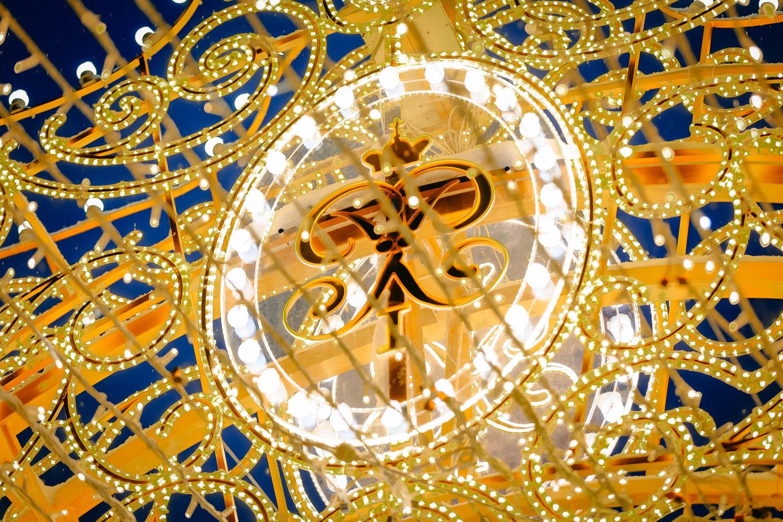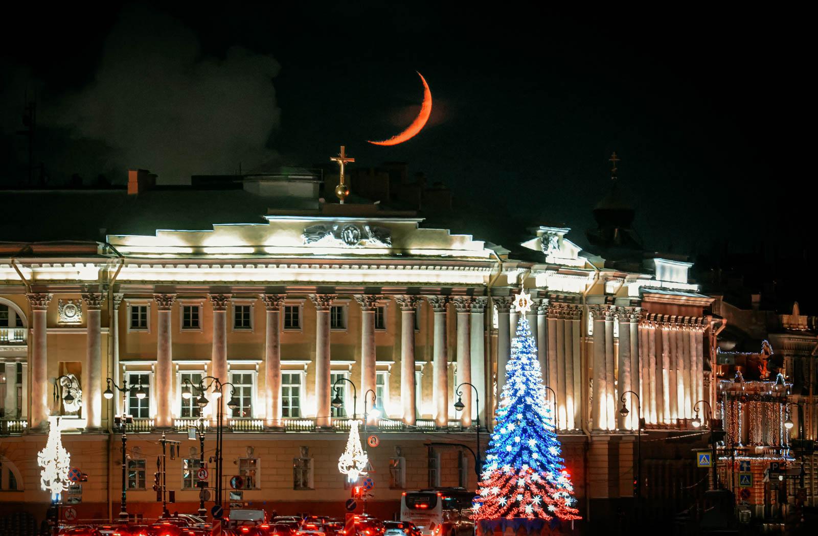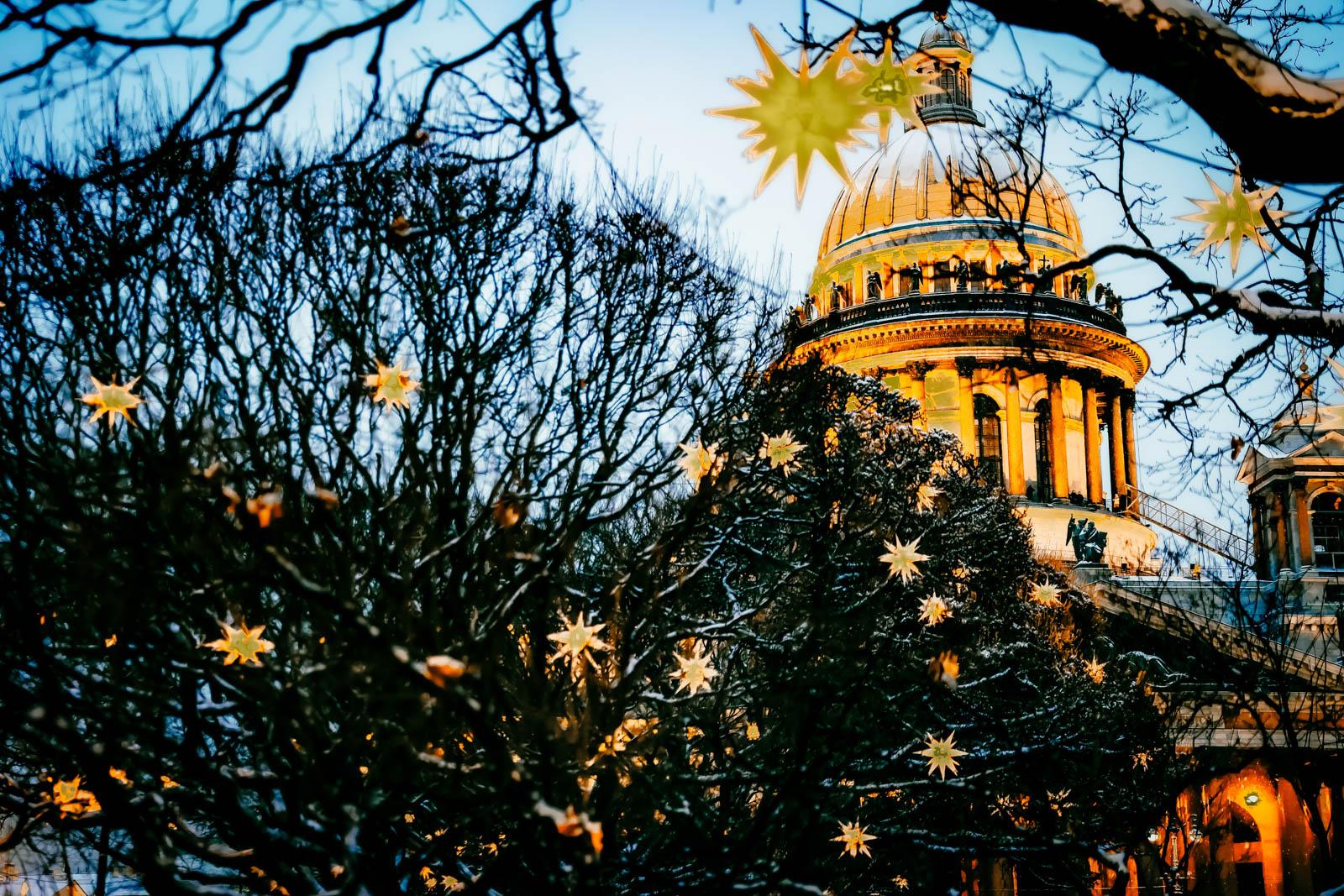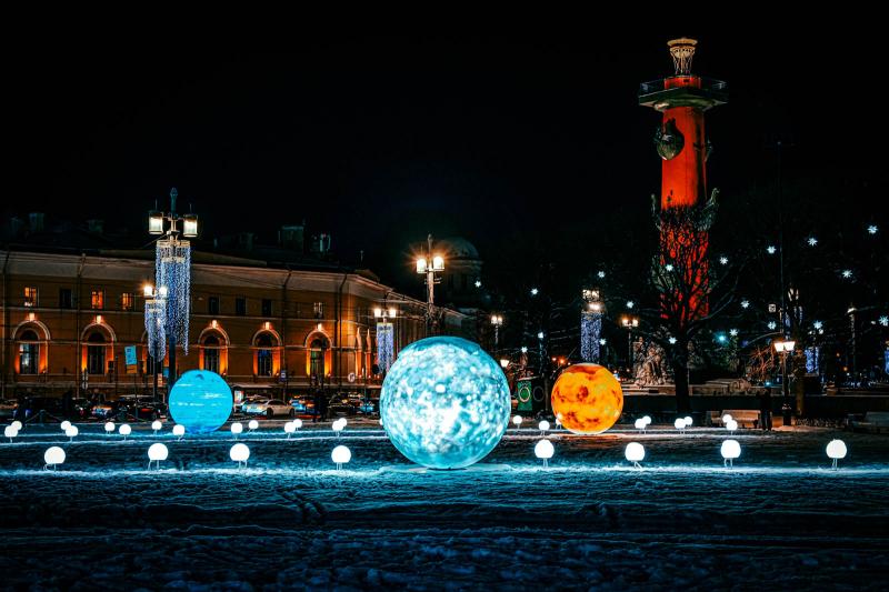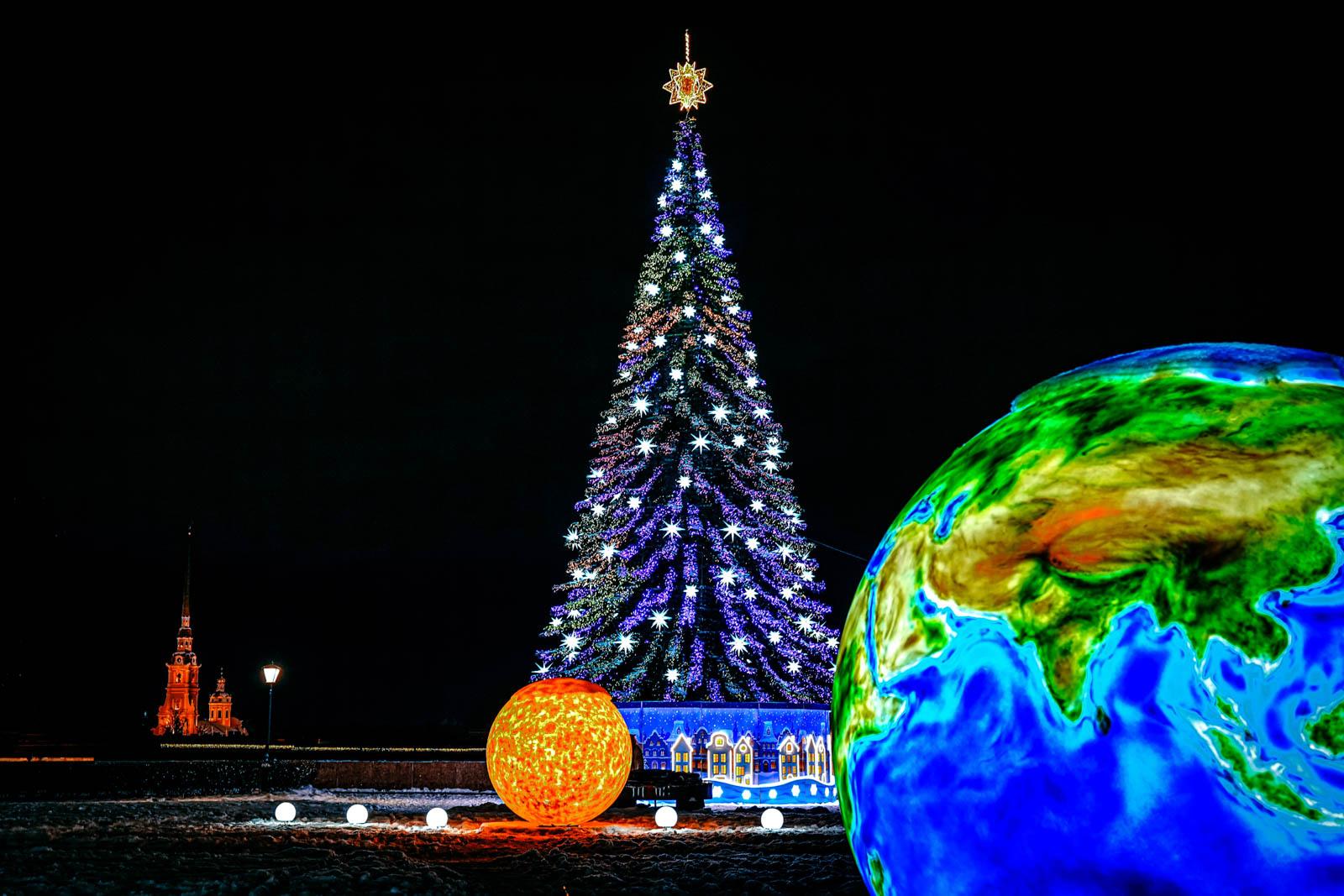 Уже в завершенном стиле оформлена стрелка Васильевского острова. На ней – композиция парада планет и мультимедийная ёлка в 20 метров высотой. А деревья на стрелке по традиции украсили рождественскими звёздами.