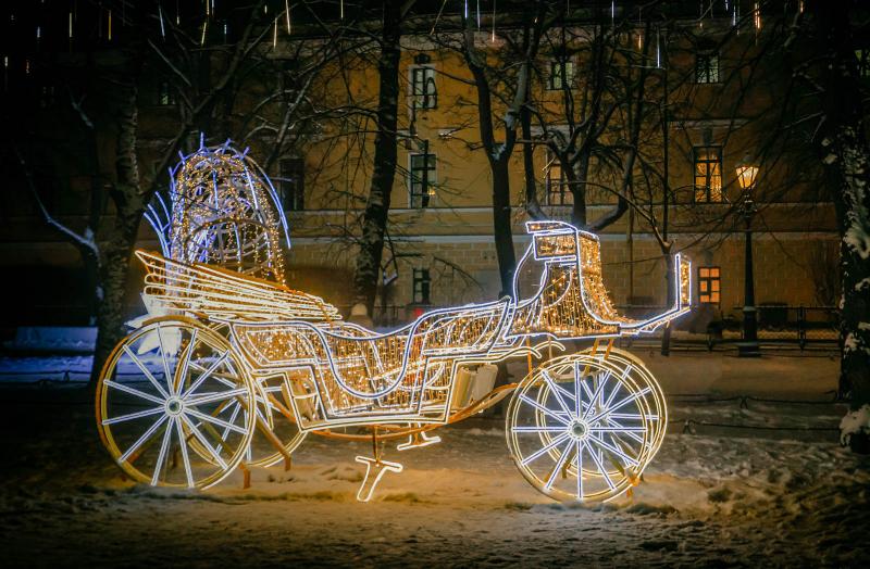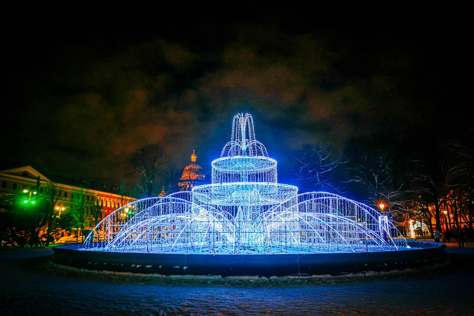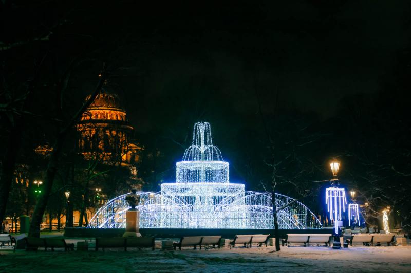 Море света и море впечатлений в этом Новом году ждут жителей и гостей города на Конногвардейском бульваре. Там три группы арок и светодиодные львы, которые охраняют вход в световой тоннель. У Медного всадника в цветах российского флага уже светится новогодняя ёлка.