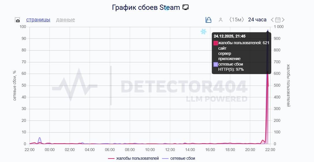 Проблемы в работе Steam зафиксировал и сервис «Сбой.рф», по данным которого по числу жалоб лидирует Москва, Петербург и Свердловская область.