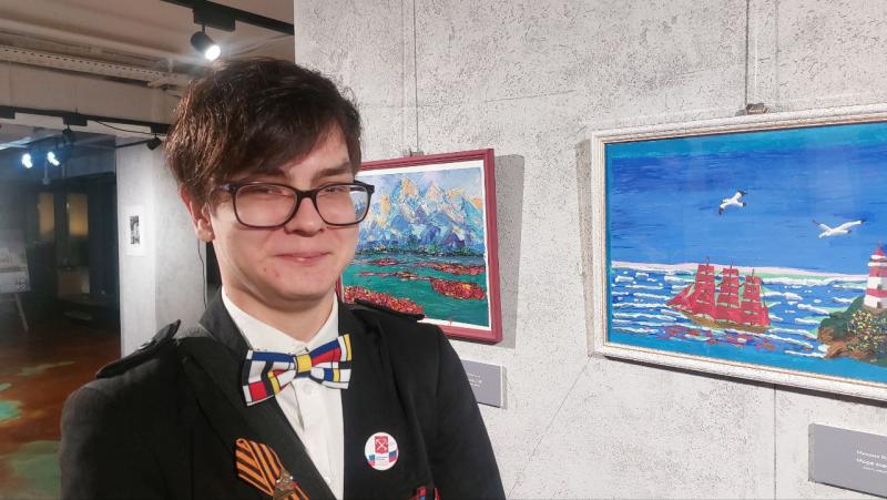 Основная часть экспозиции – работы старшеклассника школы № 1 им. Грота Михаила Карпунина. Сейчас юноше 17 лет, и он стоит перед выбором: остаться в школе до 11 класса или продолжить обучение в колледже. Но он точно знает одно: будущая профессия будет связана с творчеством.