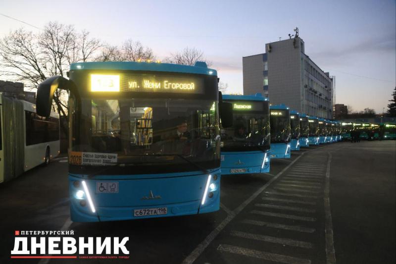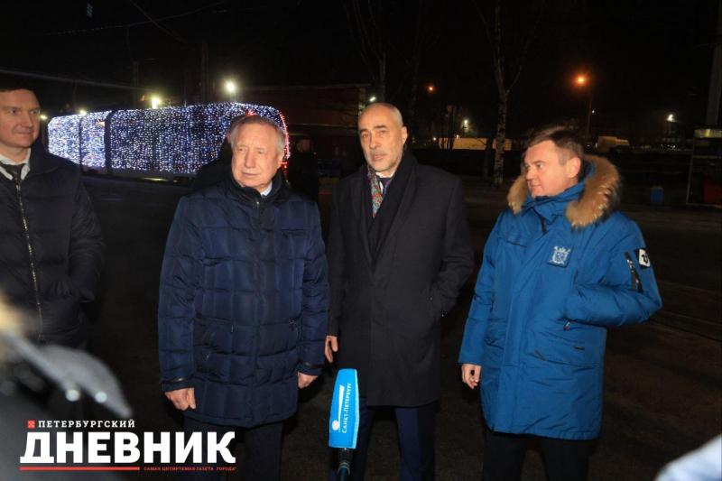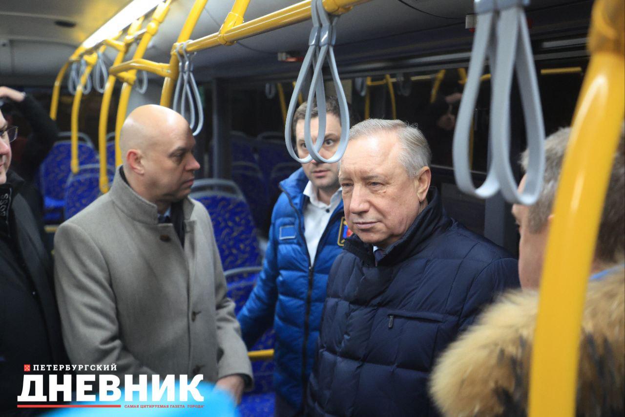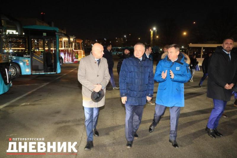 Александр Беглов проверил оснащение и работу автобусов, электробусов и трамваев.