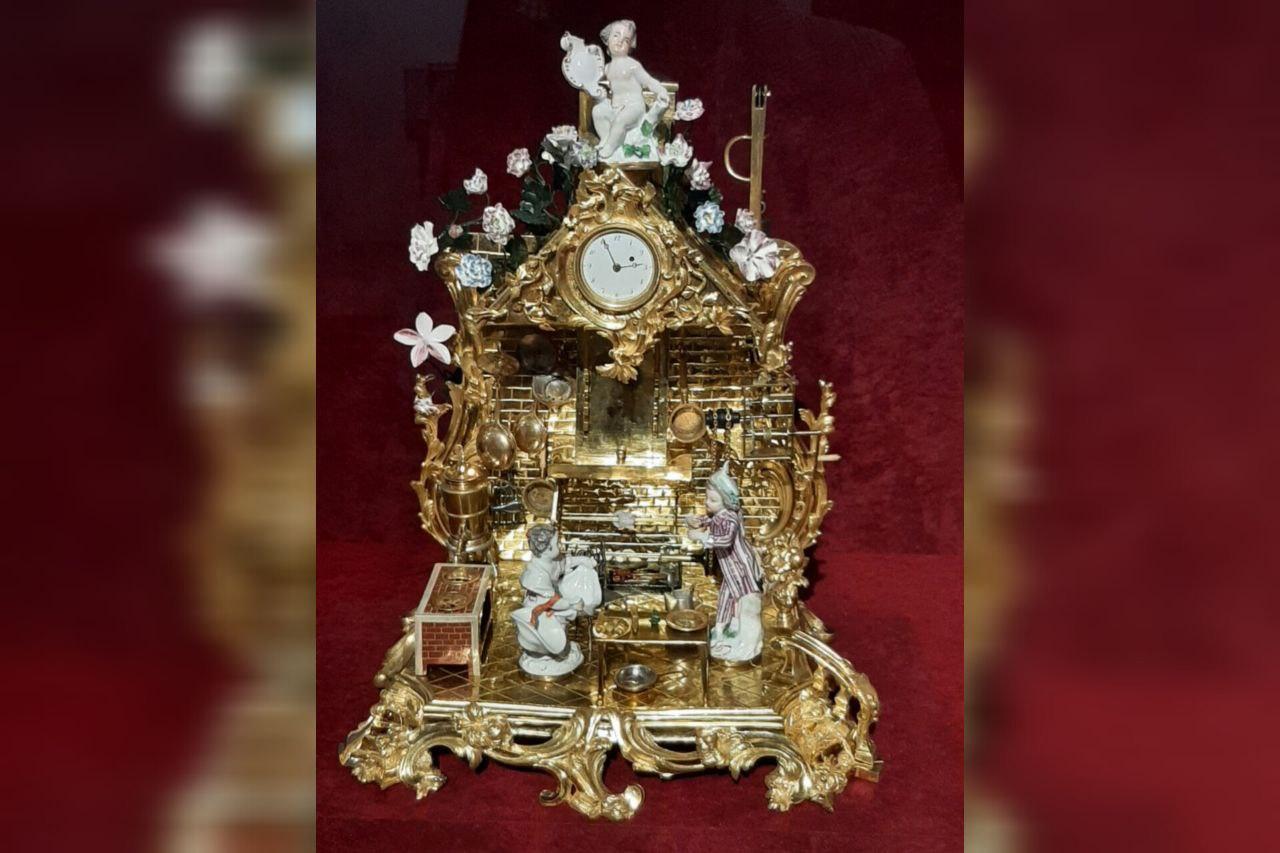 Это картины Жана Луи Валя, который работал в Петербурге, «Рождение Венеры» Ноэля-Николая Куапеля. Портшез из дерева, кожи, ткани и позолоты, на котором слуги перемещали своих хозяев в театр или в церковь. Удивительной красоты часы с изображением кухни, на которой шустрые повара готовят курицу, серебряный будуар княгини Натальи Голицыной, послужившей для Пушкина прообразом старой графини из повести «Пиковая дама». Всего, как уточнила София Владыкина, в экспозиции представлено не менее десяти экспонатов, никогда ранее не выставлявшихся.