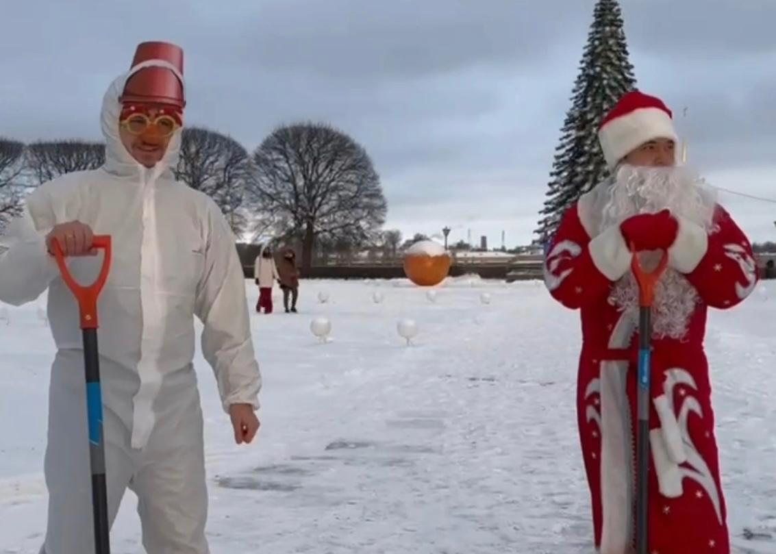 Дед Мороз и Снеговик-помощник убрали снег на стрелке Васильевского острова в Петербурге
