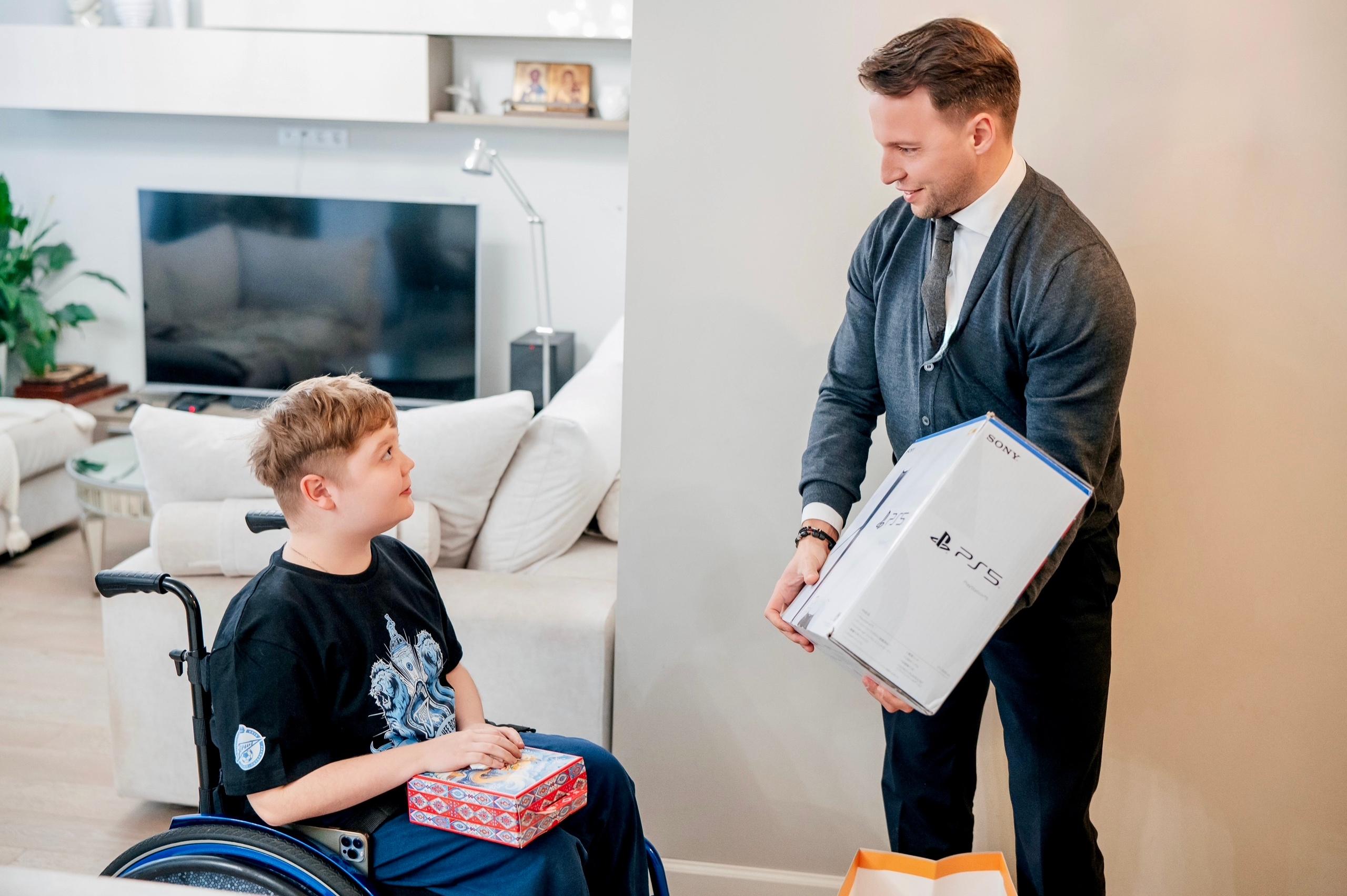 Кирилл Смирнов вручает Василию приставку и сладкий подарок. А мальчик, немного смущаясь, говорит на камеру: «Я желаю своим ровесникам, всем ребятам, чтобы они не стеснялись, не боялись. Всегда шли к своей цели, были веселые. А себе я пожелаю в будущем году сдать ОГЭ – основной государственный экзамен», – говорит Василий.