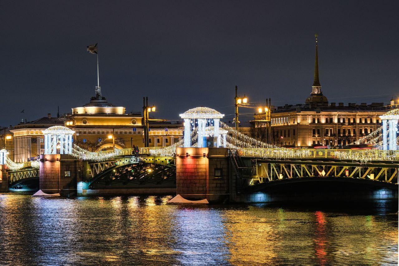Губернатор Александр Беглов сообщил, что сегодня, в Рождественский сочельник, Дворцовый и Троицкий мосты засияют золотистым цветом. Также световое оформление Троицкого моста дополнит мягкий мерцающий эффект.