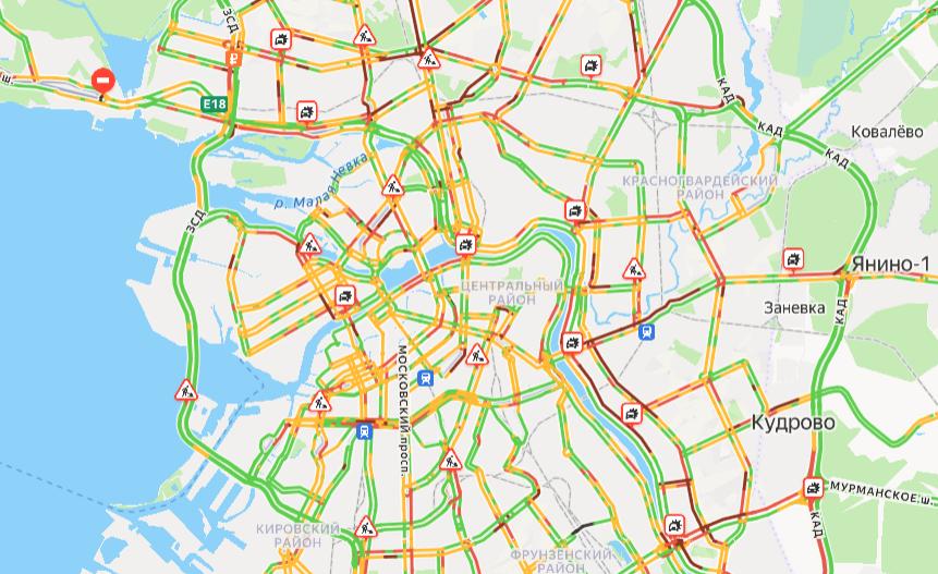Заторы есть во всех районах, автомобилисты толкаются на КАД, на Невском проспекте, шоссе Революции, проспекте Косыгина, Октябрьской набережной и Народной улице.