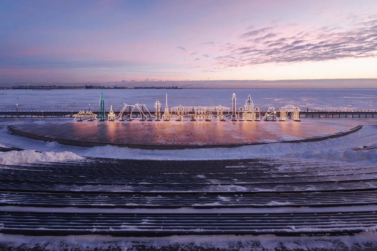 У Лахта Центра появилась масштабная зимняя инсталляция «Пульс города». На 45-метровом арт-объекте представлены 11 главных архитектурных символов Санкт-Петербурга – от исторических монументов, вроде Нарвских триумфальных ворот и Медного всадника, до современных гигантов, включая Газпром Арену и сам Лахта Центр.