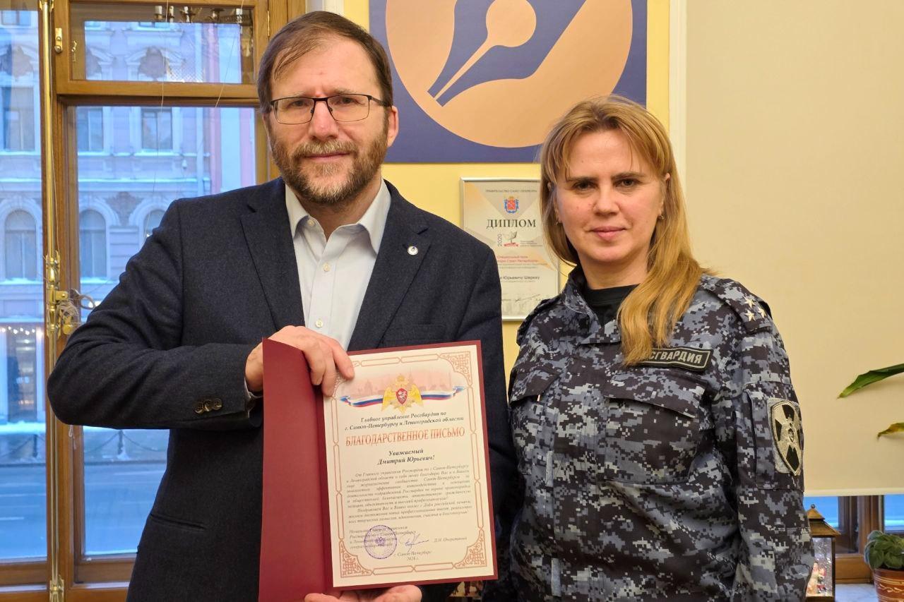Руководители пресс-службы ведомства поблагодарили коллег за сотрудничество и передали официальную грамоту от главы ГУ Росгвардии Дмитрия Очеретяного руководителю петербургского Союза журналистов Дмитрию Шериху.