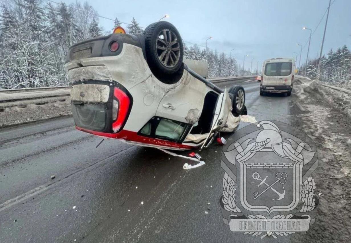 На 40-м километре Мурманского шоссе «Киа» ударилась об отбойник и перевернулась на крышу