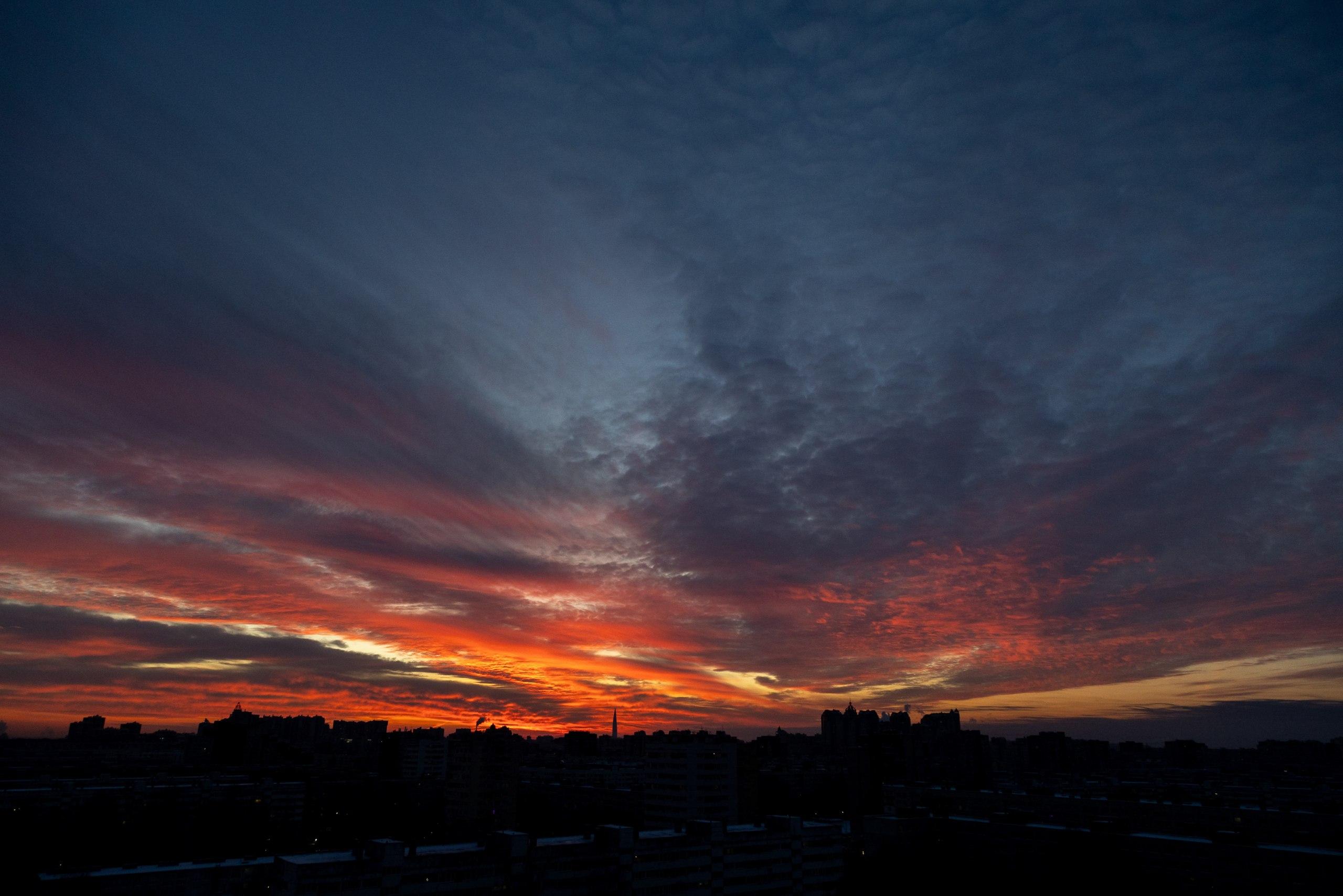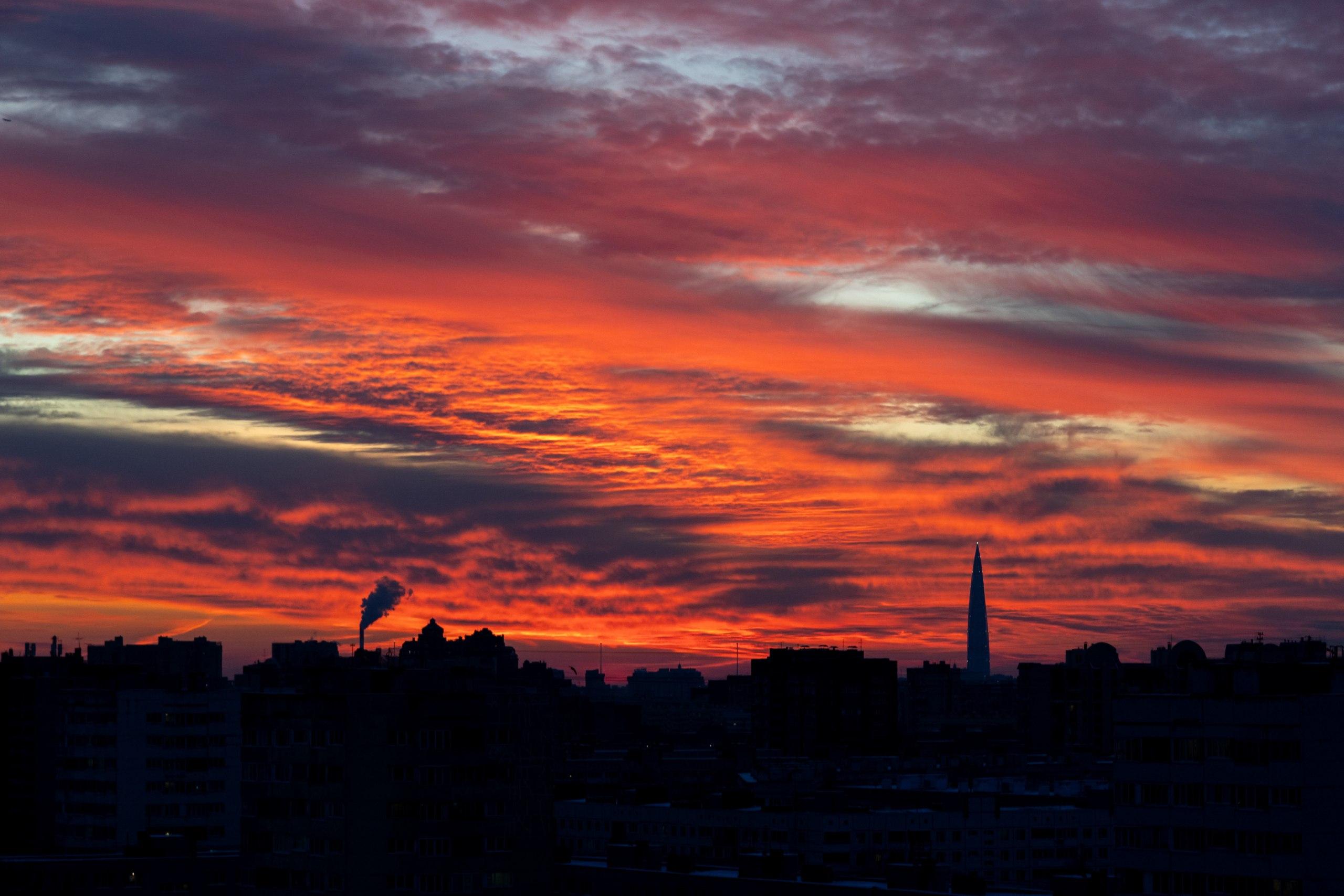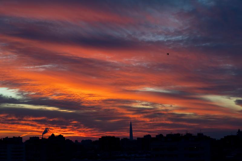 Живописный закат 17 января сделал петербургское небо похожим на полотно импрессиониста. Солнце в Северной столице скрылось за горизонтом в 16:34, оставив после себя феерию красок – яркие оранжевые всполохи вперемешку с сизо-синими мазками и совсем светлыми бежевыми «окошками».