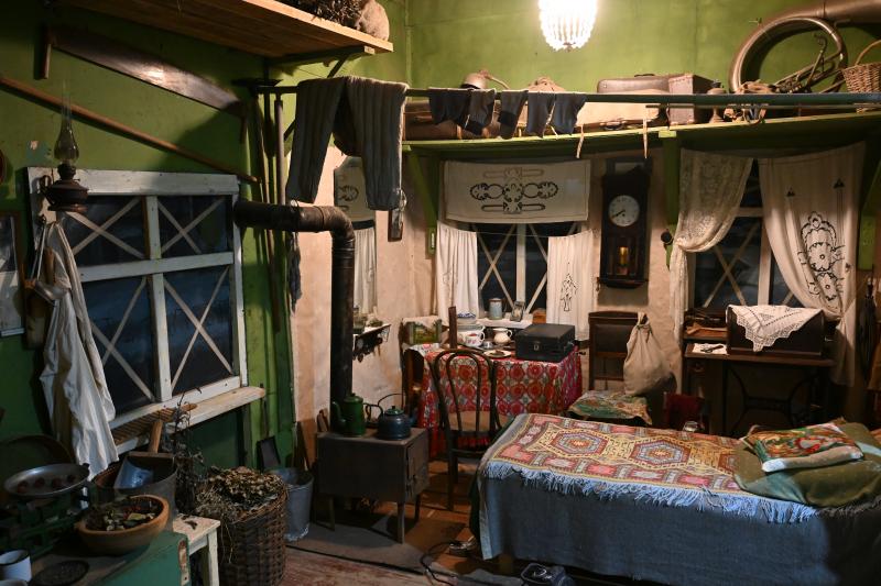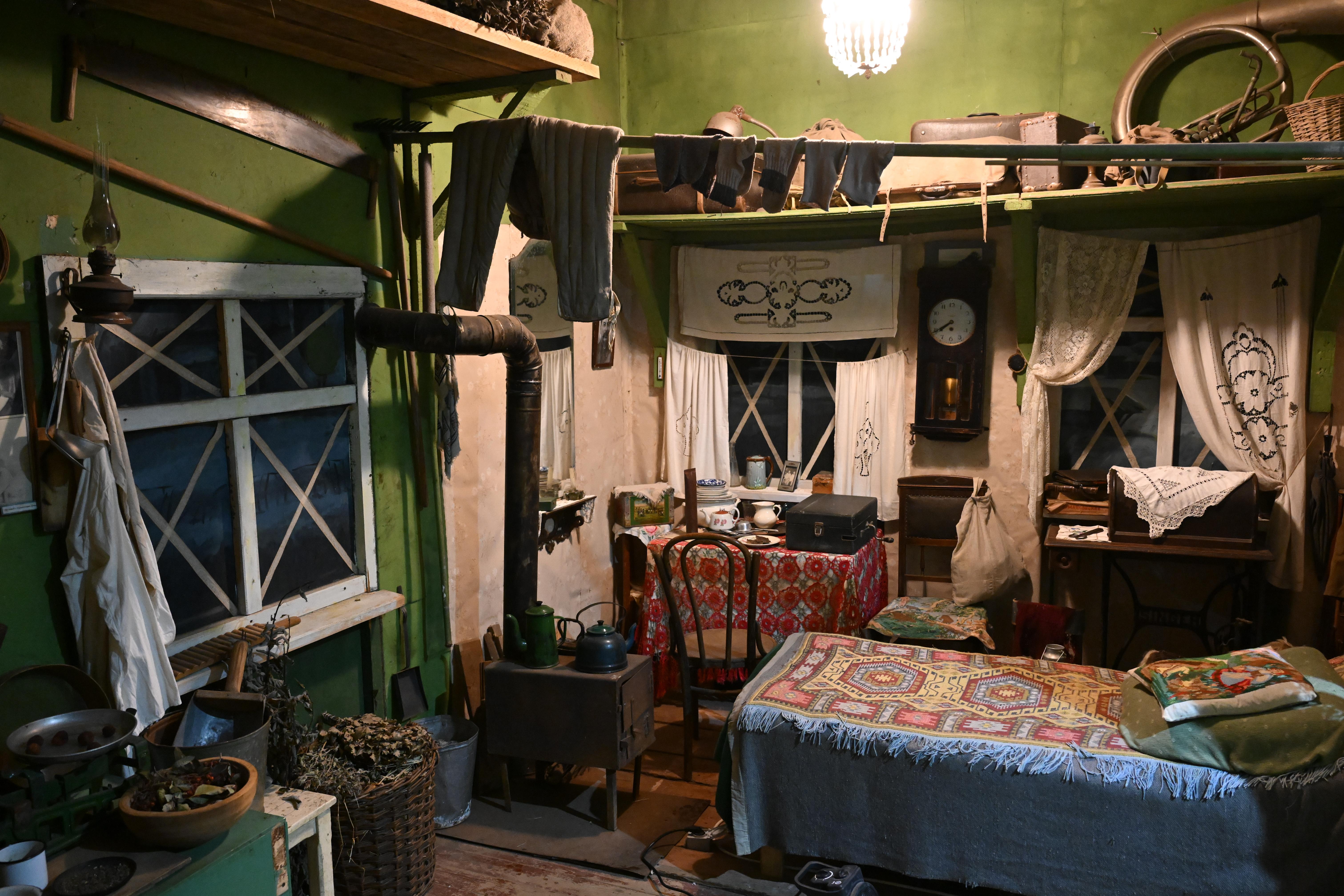 Экспозиция состоит из множества подлинных артефактов военных лет: швейная машинка «Зингер», стулья, книги, патефон, лошадка-качалка, гильза, переделанная в керосиновую лампу, фотографии, осколок фугасной бомбы и многое другое. Отдельного внимания заслуживает печка-буржуйка.