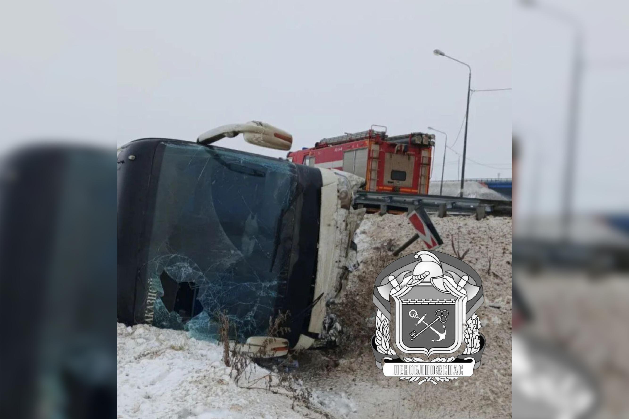 В момент происшествия в автобусе находилось 16 человек. Пострадали 4 взрослых. Заказной автобус совершал перевозку рабочих из Усть-Луги в Санкт-Петербург. На месте ДТП находятся 11 пассажиров, вопрос об их доставке в Северную столицу решается работодателем.